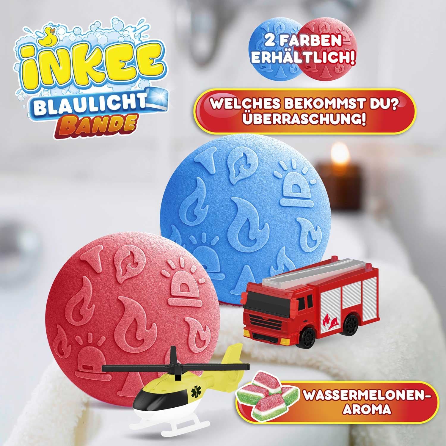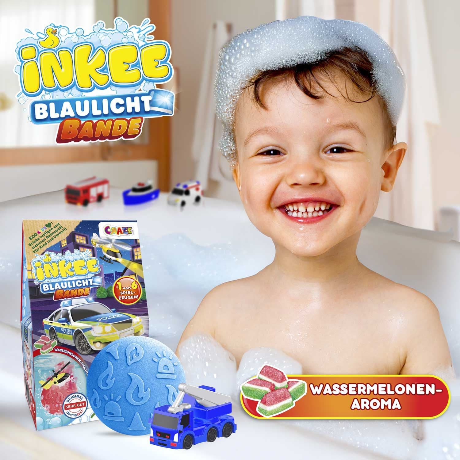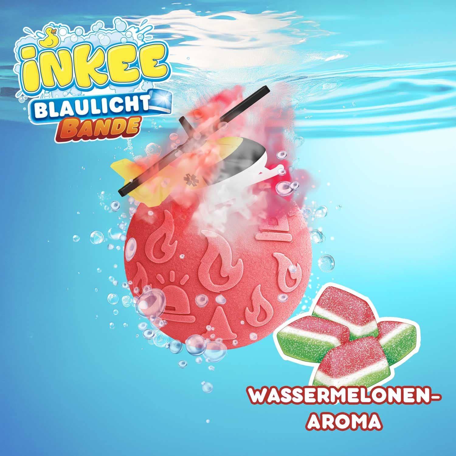 Wow! Wie das nach Wassermelonen-Gummis duftet, wie das schäumt und in welch schönen Farben! Die INKEE - Rescue Crew Überraschungs-Badekugel sorgt für viel Spaß bei kleine Helden. Während sich die Badekugel sprudelnd im Wasser auflöst und sich das Badewasser in ein wunderschönes rotes oder blaues Schaumbad verwandelt und dabei einem süßen Wassermelonen-Duft den Raum erfüllt, steigt die Spannung, welche der insgesamt 6 verschiedenen Rettungsfahrzeuge sich wohl in der Badekugel befindet.