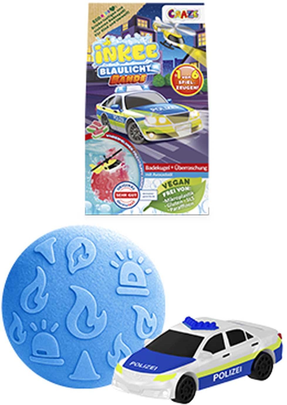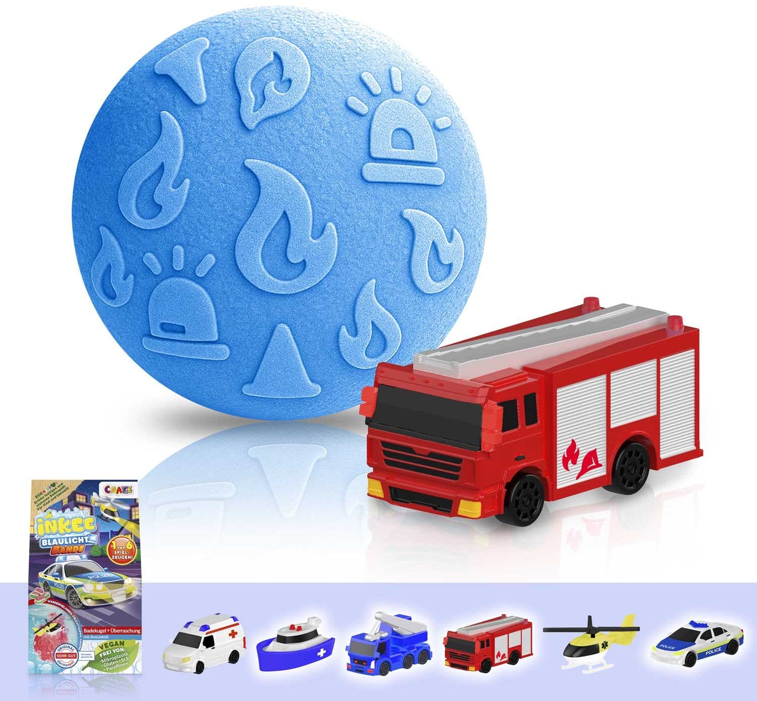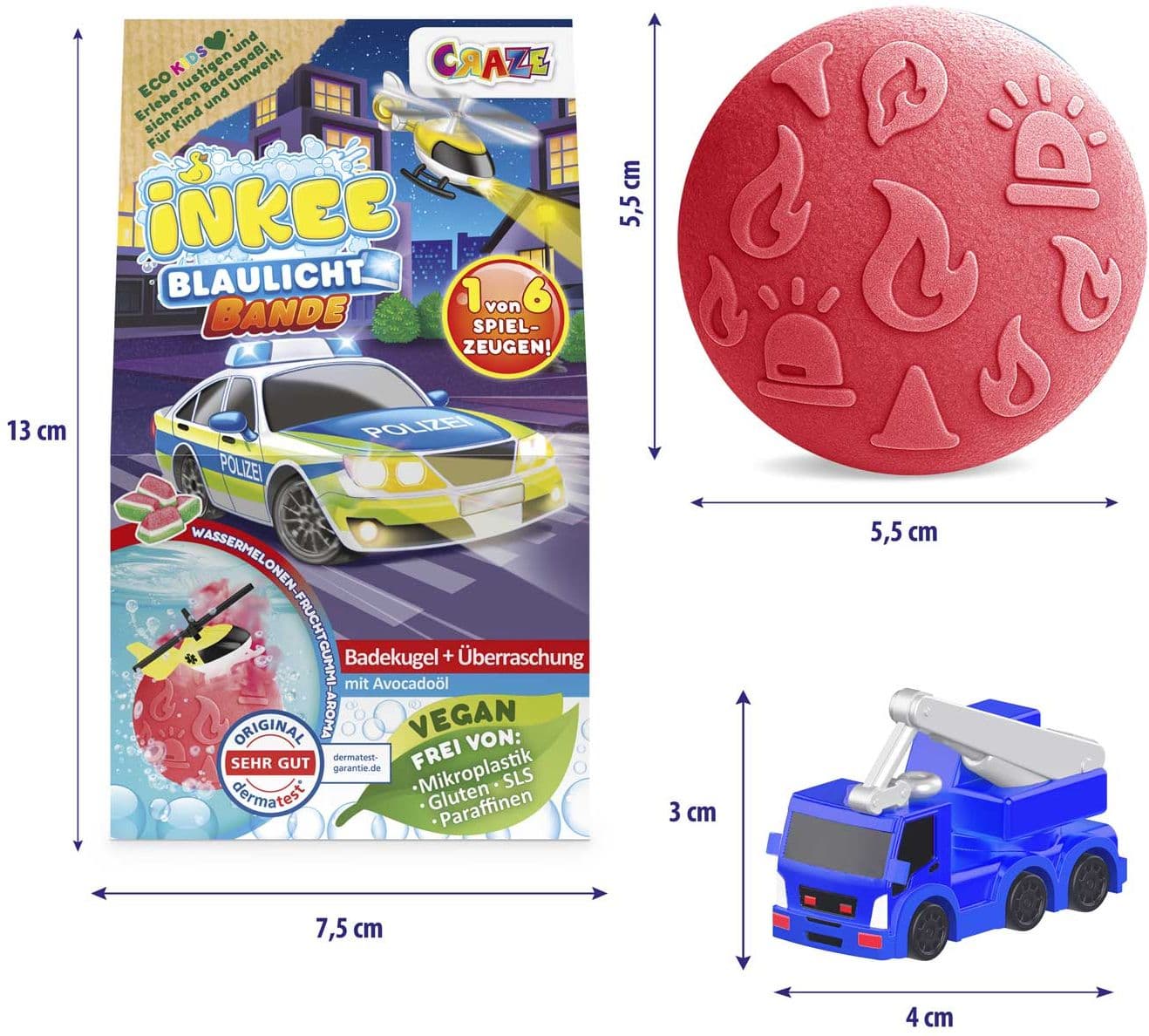 Wow! Wie das nach Wassermelonen-Gummis duftet, wie das schäumt und in welch schönen Farben! Die INKEE - Rescue Crew Überraschungs-Badekugel sorgt für viel Spaß bei kleine Helden. Während sich die Badekugel sprudelnd im Wasser auflöst und sich das Badewasser in ein wunderschönes rotes oder blaues Schaumbad verwandelt und dabei einem süßen Wassermelonen-Duft den Raum erfüllt, steigt die Spannung, welche der insgesamt 6 verschiedenen Rettungsfahrzeuge sich wohl in der Badekugel befindet.