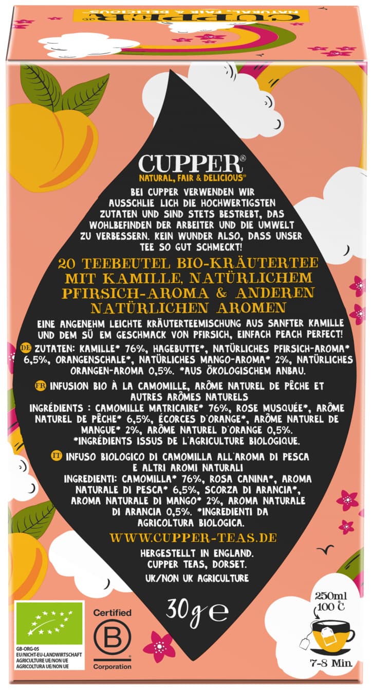 | Zutaten | Kamille*, Hagebutte*, Natürliches Pfirsich-Aroma*, Orangenschale*, Natürliches Mango-Aroma*, Natürliches Orangen-Aroma* (*aus ökologischem Anbau) |