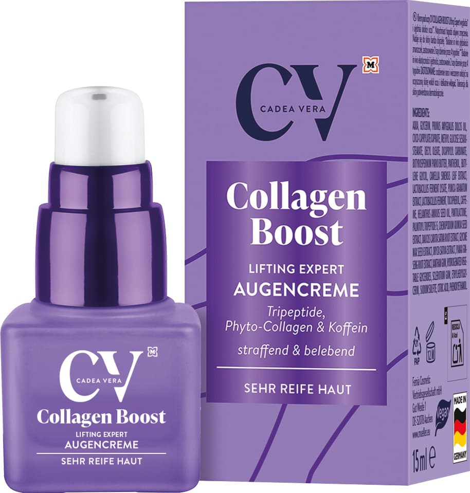Die CV COLLAGEN BOOST Lifting Expert Augencreme mit Tripeptide, Phyto-Collagen und Koffein glättet** und strafft*** die empfindliche Augenpartie, pflegt intensiv und wirkt sofort erfrischend. Täglich angewendet werden Müdigkeitserscheinungen, sowie feine Linien und Falten rund um die empfindliche Augenpartie gemildert**. Für eine frische und verjüngte Ausstrahlung.