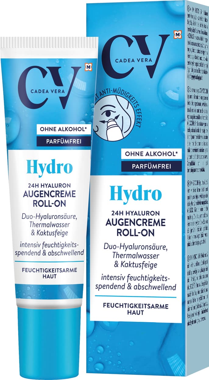 Die CV HYDRO 24h Hyaluron Augencreme im Roll-On mit Duo- Hyaluronsäure, Thermalwasser und Kaktusfeigen-Extrakt spendet sofort erfrischende und bis zu 24h intensive Feuchtigkeit*, wirkt Trockenheitsfältchen effektiv entgegen und glättet feine Linien**. Die kühlende Massagekugel lindert Schwellungen und spendet sofort einen Frische-Kick.