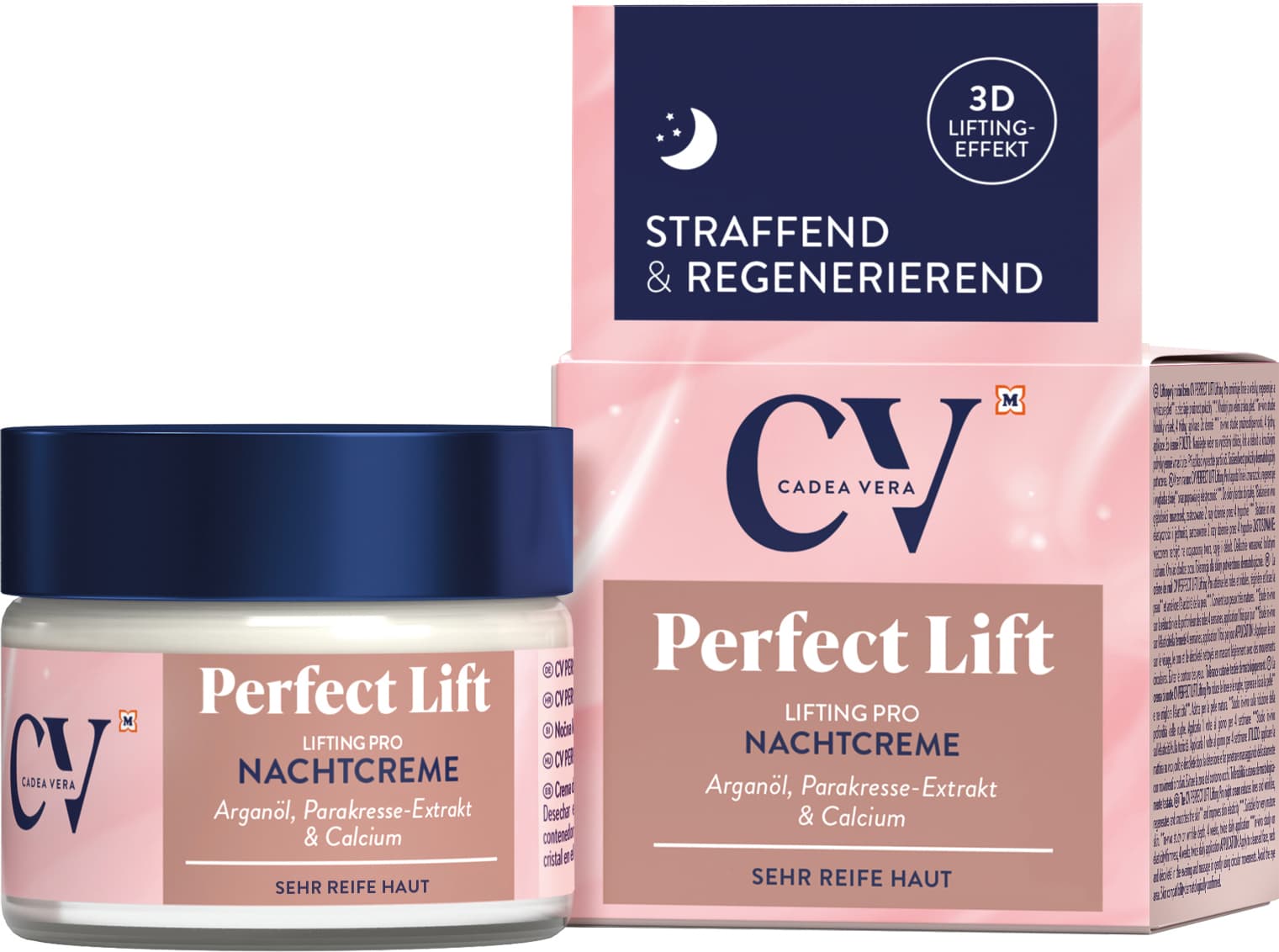 Die CV Perfect Lift Lifting Pro Nachtcreme glättet die Haut mit Sofort-E_x001f_ekt*. DieLifting Formel mit Arganöl, Parakresse-Extrakt, Plant-Retinol-Extrakt und Calcium spendet überNacht intensive Feuchtigkeit. Täglich angewendet, wird die Faltentiefe gemildert** und die Hautelastizitätverbessert***. Für ein stra_x001f_eres Hautbild und intensiv erholte Ausstrahlung am Morgen.Wirksto_x001f_-PowerArganöl: unterstützt den Regenerationsprozess der Haut, schützt vor Trockenheit und pflegt die Haut intensiv.Parakresse: stärkt das Kollagengerüst und festigt die Hautstruktur. Mildert Linien und Falten nachweislichvom ersten Tag an*.Calcium: unterstützt den Au_x001d_au der Hautbarriere und fördert die Vitalität und Restrukturierung der Haut.Plant-Retinol-Extrakt: stimuliert die Hauterneuerung und Kollagensynthese und hilft die Haut zu glätten.Hyaluronsäure und pflanzliches Glycerin: helfen der Haut, Feuchtigkeit zu speichern. Trockenheitsfältchenerscheinen gemildert und die Haut wirkt praller und wie von innen aufgepolstert.*Wirksto_x001f_ Parakresse, in-vivo-Studie mit 28 Probanden, 2x tägliche Anwendung über 28 Tage.**in-vivo Studie zur Faltentiefenreduktion, 4 Wochen, 1-mal tägliche Anwendung***in-vivo Studie zur Elastizität/Festigkeit, 4 Wochen, 1-mal tägliche Anwendung