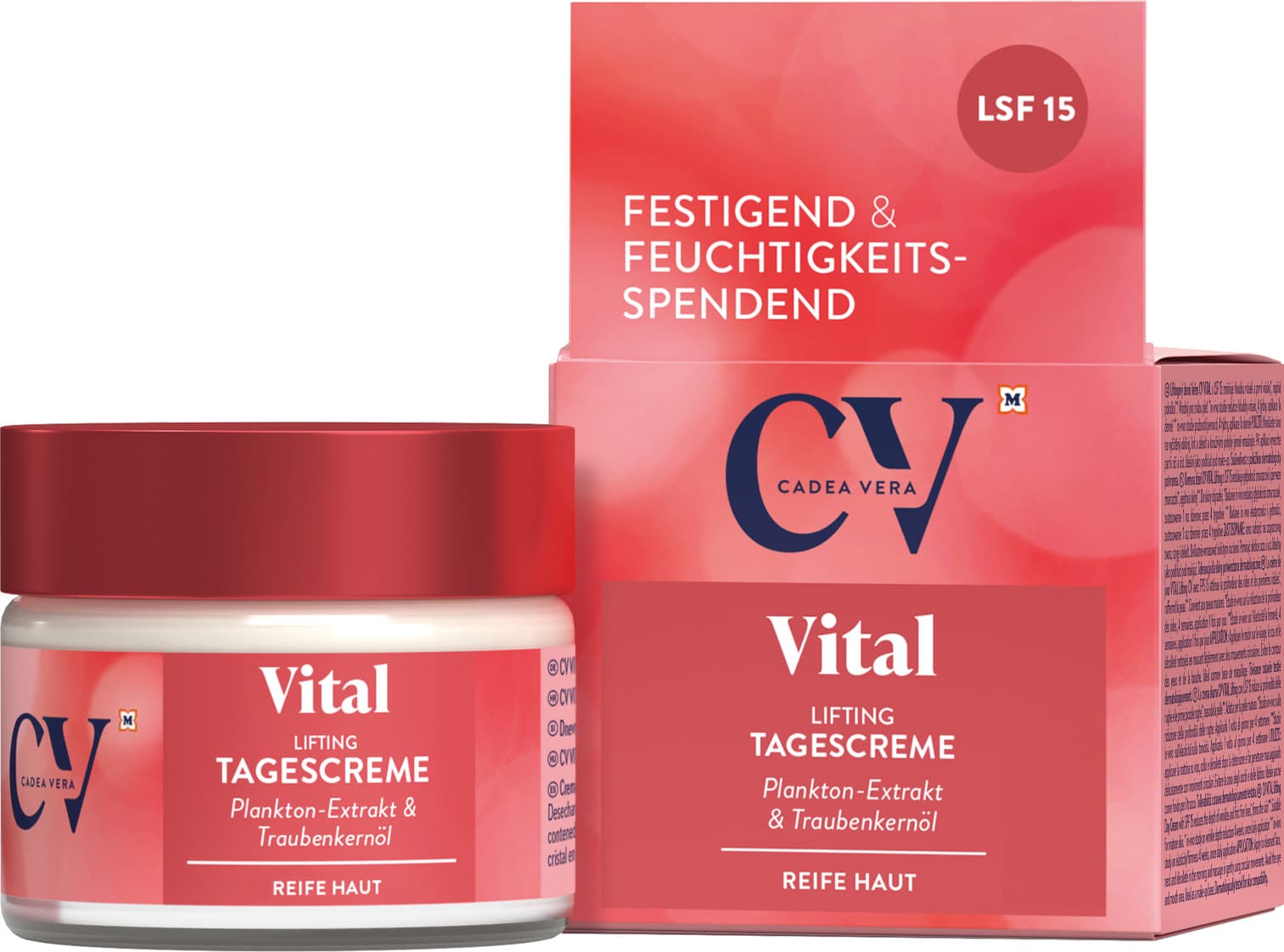 Die CV VITAL Lifting Tagescreme strat das Hautbild*, mildert die Faltentiefe und erste Fältchen nachweisbar**. Die Anti-Falten Formel mit Plankton-Extrakt und Traubenkernöl, spendet intensive Feuchtigkeit, mildert Irritationen und Spannungsgefühle. Für ein sofortiges Wohlgefühl, jugendlich glatte Haut und einen frischen Glow.