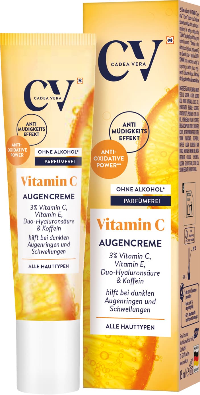 Die CV VITAMIN C AUGENCREME verbessert, dank ihrer Antioxidativen-Power-Formel** mit 3% Vitamin C + E, Duo-Hyaluronsäure und Koffein, das Erscheinungsbild der gesamten Augenpartie sichtbar.