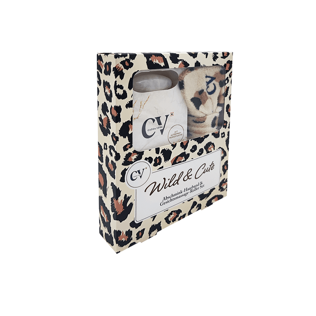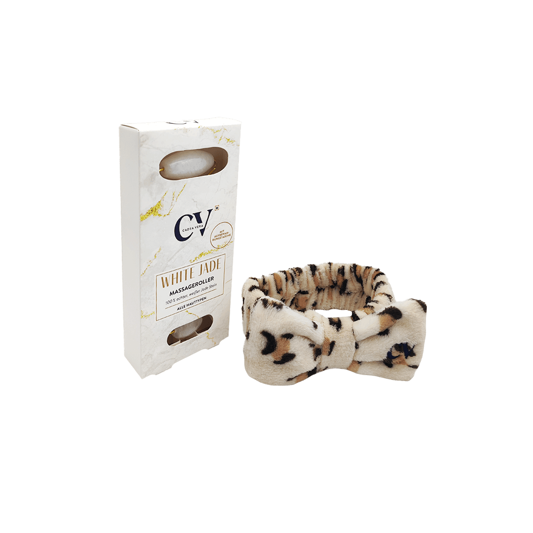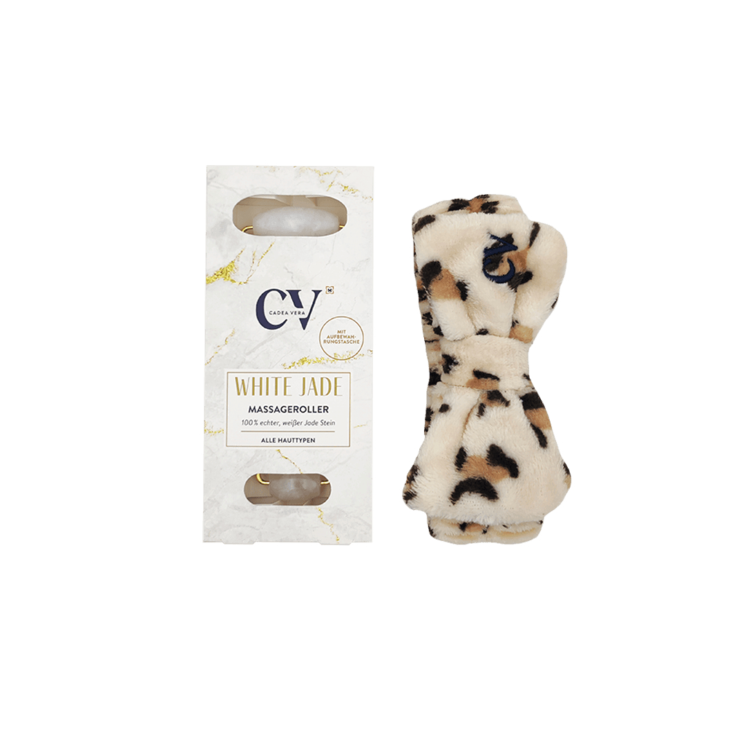 Das CV WILD & CUTE Set kombiniert ein anschmiegsames Abschmink-Haarband mit einem Gesichtsmassageroller – ideal für eine entspannte Pflegeroutine. Das Abschmink-Haarband hält die Haare sanft und sicher aus dem Gesicht und macht die Gesichtsreinigung sowie Pflegeanwendung noch angenehmer. Der kühlende Massageroller aus weißer Jade liegt gut in der Hand und ergänzt die Gesichtspflege perfekt. Bei regelmäßiger Anwendung kann er die Durchblutung fördern, die Hautstruktur festigen und Schwellungen sichtbar mildern – für einen frischen, erholten Teint und ein rundum entspanntes Hautgefühl.
