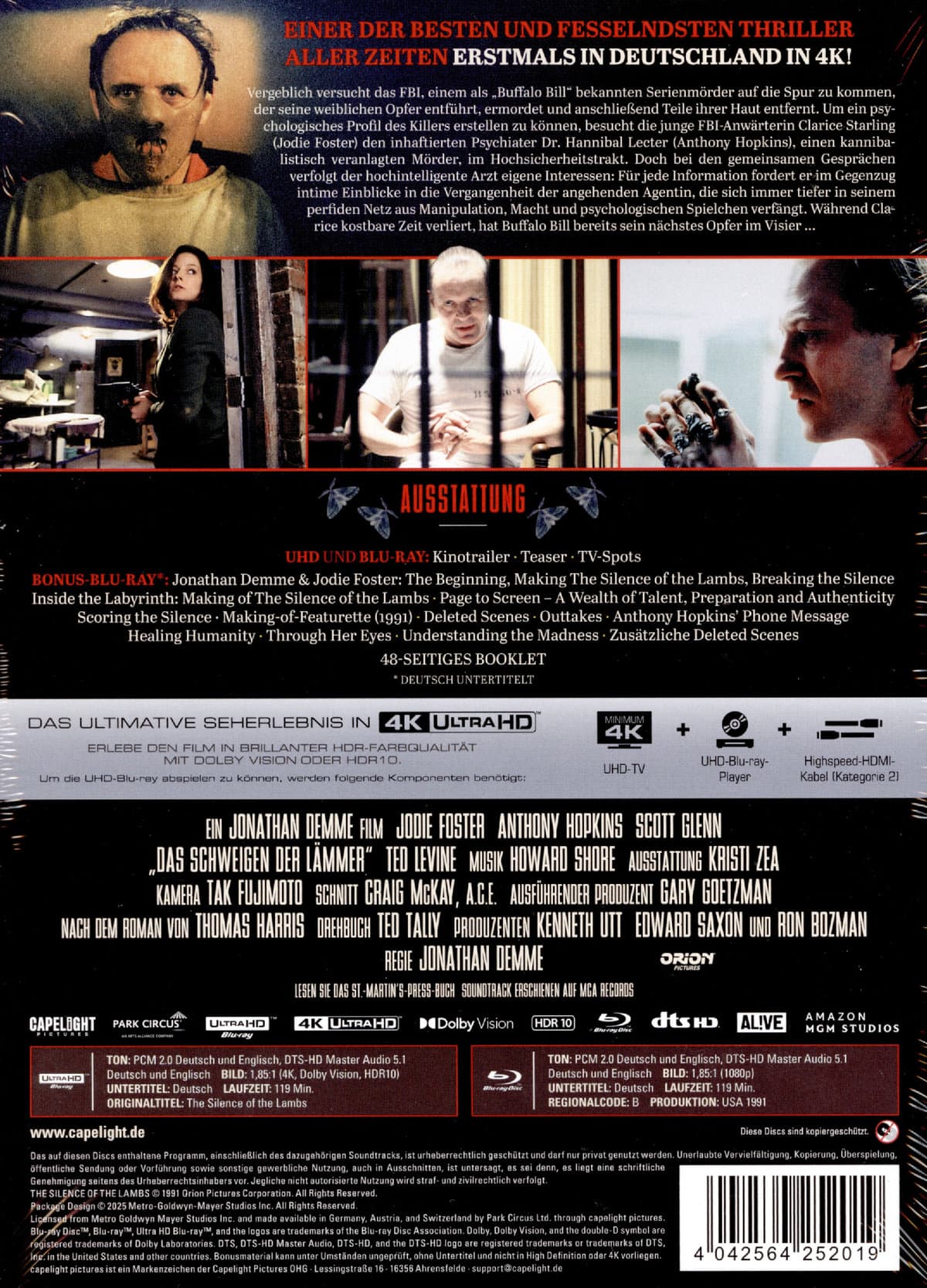 | Zusatzinfos / Bonusmaterial beim Film dabei | Limitiertes Mediabook mit dem Film auf UHD-Blu-ray (in 4K Ultra HD mit Dolby Vision und HDR10); auf Blu-ray; einer Bonus-Blu-ray und einem 48-seitigen BookletBonus: Kinotrailer; Teaser; TV-SpotsBonus-Blu-ray:Jonathan Demme & Jodie Foster: The Beginning; Making The Silence of the Lambs; Breaking the Silence; Inside the Labyrinth: Making of The Silence of the Lambs; Page to Screen – A Wealth of Talent; Preparation and Authenticity; Scoring the Silence; Making-of-Featurette (1991); Deleted Scenes; Outtakes; Anrufbeantworter von Anthony Hopkins; Healing Humanity; Through Her Eyes; Understanding the Madness; Zusätzliche Deleted Scenes |