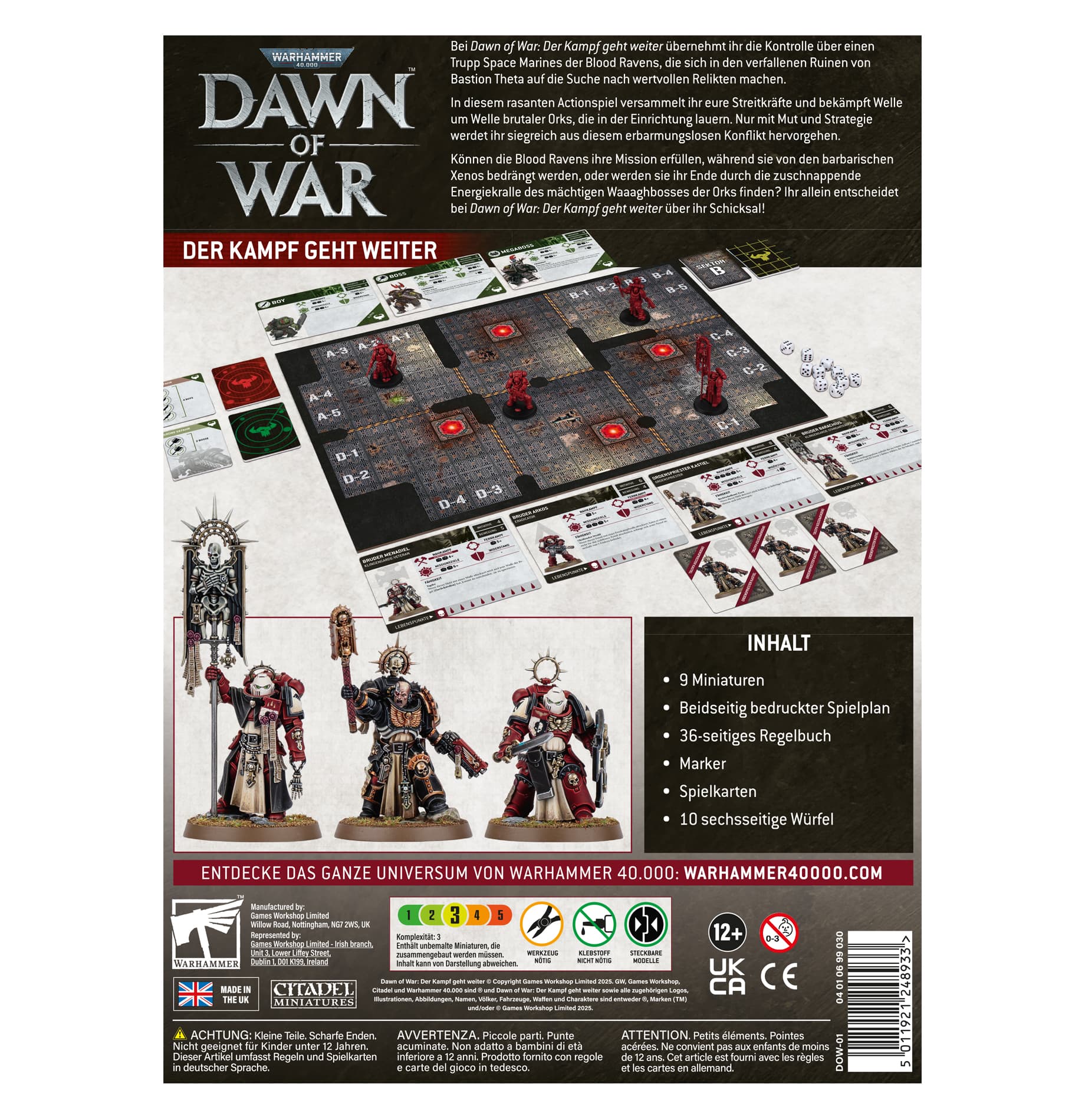 Warhammer 40.000: Dawn of War – Der Kampf geht weiter "Warhammer 40.000: Dawn of War – Der Kampf geht weiter ist ein spannendes, taktisches Brettspiel in der Finsternis der fernen Zukunft, das auf der gleichnamigen Hit-Videospielreihe basiert. Übernimm die Kontrolle einer Eliteeinheit der Space Marines der Blood Ravens und verteidige dich mit Klinge und Bolter gegen die Wellen der Orks. Wenn du ein Fan der Videospiele bist, ist das deine Gelegenheit, die Action vom Bildschirm auf den Tisch zu bringen. Spiele alleine oder mit bis zu drei Freundinnen oder Freunden, wählt eure Helden und kämpft gemeinsam für den Schutze der Menschheit gegen die schier endlosen Horden der Xenos. – Kooperatives, taktisches Brettspiel für ein bis vier Spieler– Neun hochdetaillierte Kunststoffminiaturen, die ohne Klebstoff zusammengebaut werden können– Rasanter und strategischer Spielspaß, herausfordernde Kämpfe und Kontrolle über Missionsziele– Enthält alles, was du zum Spielen brauchst, inklusive Spielbrett, Würfel, Karten und Marker– Das 36-seitige Beiheft enthält die Regeln für das Spiel und Bauanleitungen Das Spiel enthält: 9x push-fit Space Marine Miniaturen