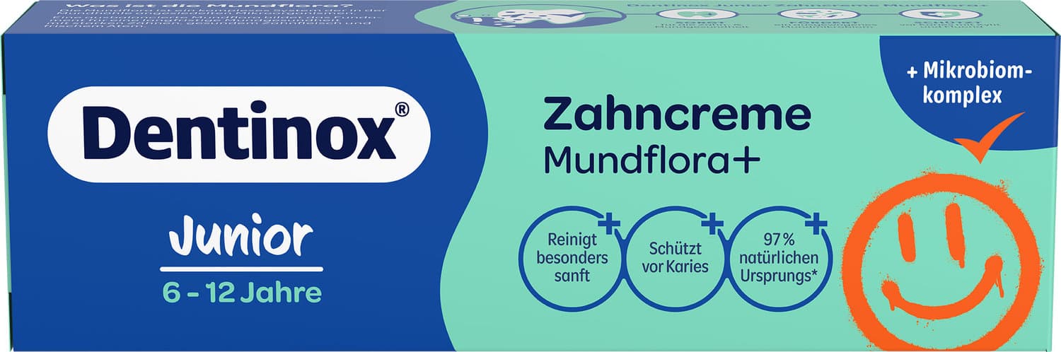 Die Dentinox® Zahncreme Mundflora+ Junior ist ideal für die Zahnpflege von Kindern zwischen 6 und 12 Jahren – die sensible Phase des Zahnwechsels, in der Milchzähne ausfallen und bleibende Zähne heranwachsen. In dieser Zeit benötigen Zähne und Zahnfleisch besonderen Schutz und Pflege. Die Fluorid-Zahnpasta für Kinder unterstützt den Zahnwechsel mit einer mikrobiomfreundlichen Formel, stärkt den Zahnschmelz und kommt ohne unnötige Zusatzstoffe aus.