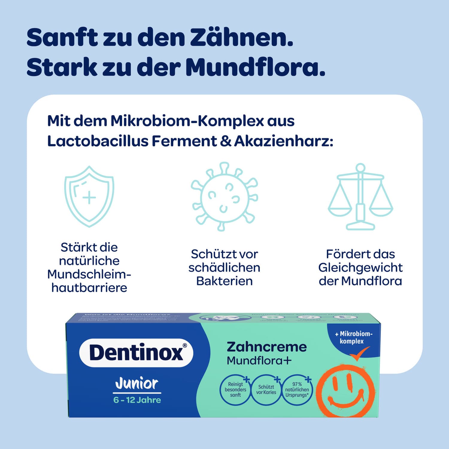 Mit einem fruchtig-frischen Geschmack begleitet die Dentinox Zahncreme Mundflora+ Junior deine Kinder durch die Zahnpflege – sanft und sicher.