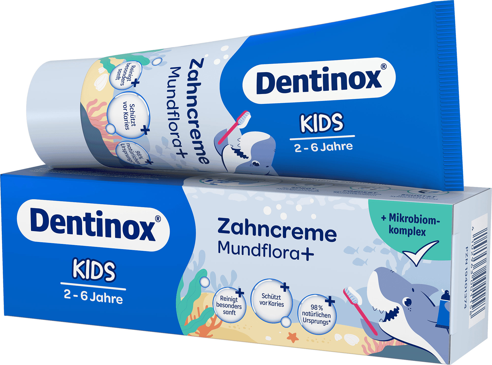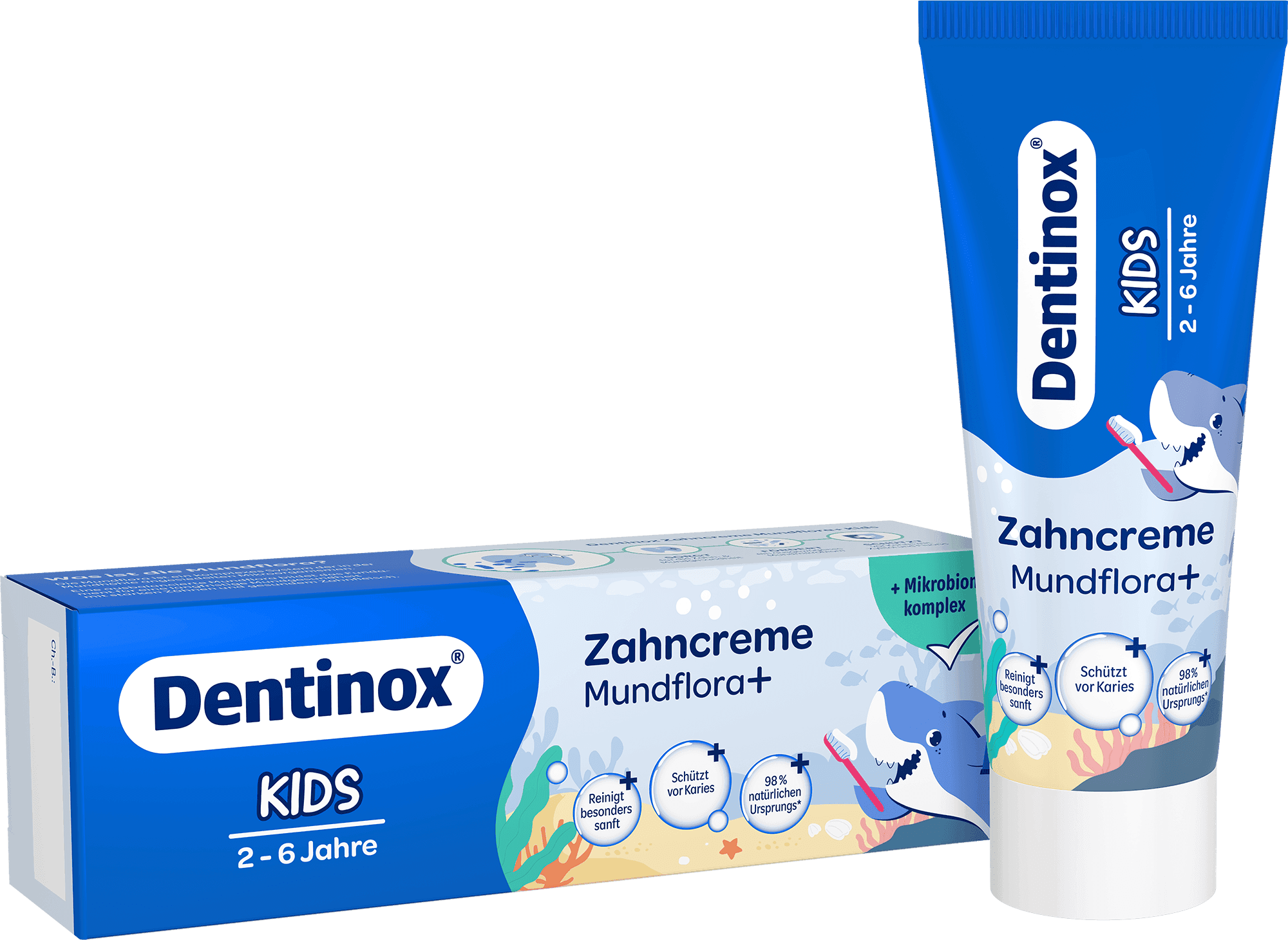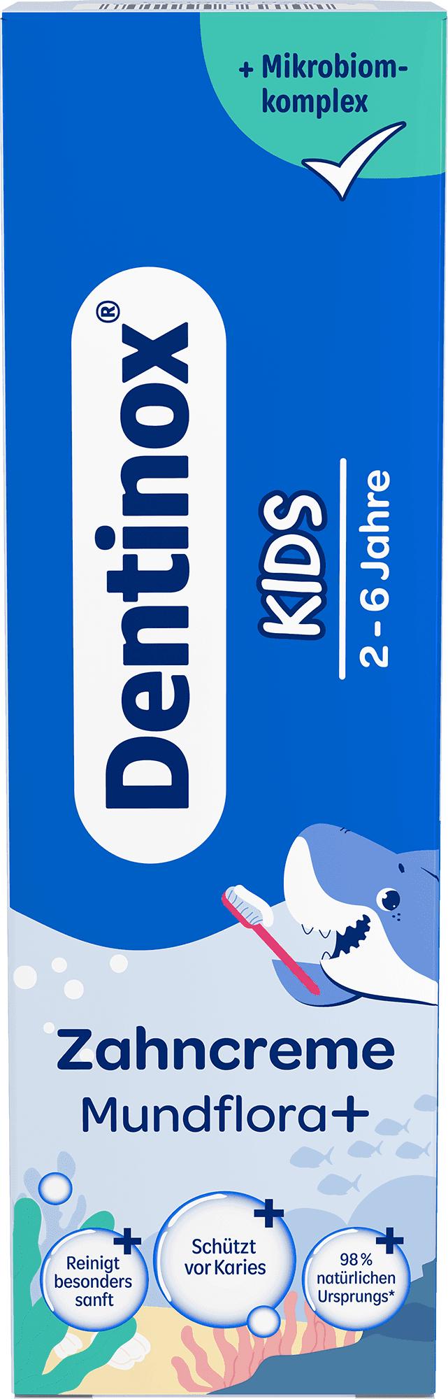 Starke Milchzähne mit sanfter Pflege: Die Dentinox Zahncreme Mundflora+ Kids wurde für Kinder im Alter von 2 bis 6 Jahren entwickelt – eine Zeit, in der Milchzähne besonders schutzbedürftig sind. Dank 1.000 ppm Fluorid werden die Zähne remineralisiert und vor Karies geschützt, während Xylitol aktiv gegen schädliche Bakterien wirkt. Der Mikrobiom-Komplex aus Lactobacillus-Ferment und Akazienharz unterstützt die gesunde Mundflora, Panthenol und Hyaluron beruhigen und regenerieren das Zahnfleisch. Die milde Reinigung erfolgt durch pflanzliche Cellulose, die Plaque schonend entfernt. Die Rezeptur ist zu 98% natürlich, vegan, homöopathieverträglich und frei von Zucker, Farbstoffen, Konservierungsstoffen, Laktose und Gluten – ideal für die tägliche, kindgerechte Zahnpflege.