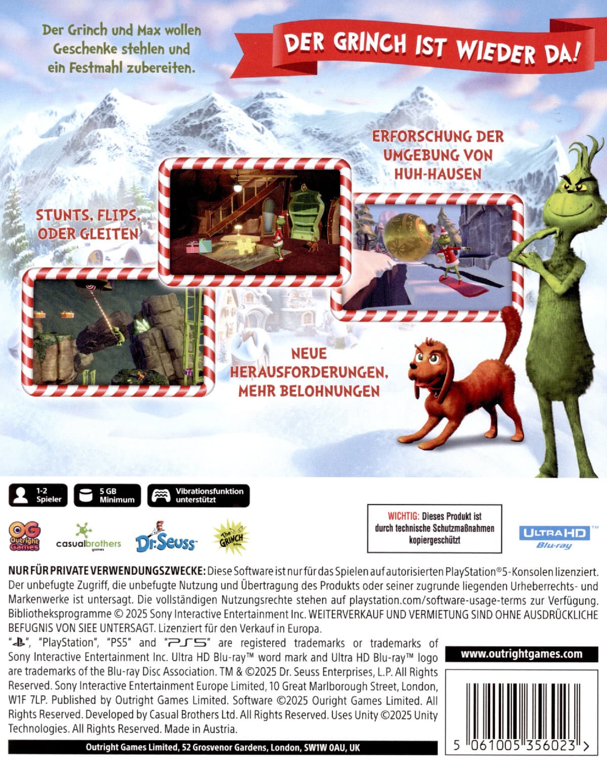 Hat der Grinch Weihnachten liebgewonnen oder ist alles nur Show? In dieser fröhlich-verschmitzten Ausgabe der Weihnachtsabenteuer mit dem Grinch geht es mit Snowboard, Schlitten und Fallschirm durch ganz Huh-Hausen, um Weihnachtsstimmung zu verbreiten. Der Grinch und Max stellen sich cleveren Herausforderungen, um Geschenke zu sammeln. Und vielleicht ist das Herz des Grinch am Ende sogar um drei Nummern größer! Auch wenn es Spaß macht, unartig zu sein, werden die Huhs deine nette Seite kennenlernen, wenn sie dein Festmahl genießen. Coole Gadgets und Belohnungen helfen dabei, Zinnsoldaten, Lebkuchenmännern und Bäumen auszuweichen. Rettet der Grinch Weihnachten oder stiehlt er es? Du hast es in der Hand. FEATURES • DURCH UND UM HUH-HAUSEN - Erkundung des Dorfes, des Rathauses, der Grinch-Höhlen, Seen und der Kanalisation • STUNTS, FLIPS ODER GLEITEN - Mit Jetpacks, Snowboards, Schlitten und anderen anpassbaren Gadgets • MISSIONEN MIT AUSBLICK - Sammelobjekte und Gegner können mit Max' Fallschirm aus der Luft aufgespürt werden • NEUE HERAUSFORDERUNGEN, MEHR BELOHNUNGEN - Mit gesammelten Lebensmitteln und Geschenken können Rätsel, Kunst und Accessoires gewonnen werden • EIN KLASSIKER FÜR ALLE - Einfach zu bedienen und visuell an die Originalbücher angelehnt Sprachen: Deutsch, Englisch, Französisch, Italienisch, Spanisch, Niederländisch Untertitel: Deutsch, Englisch, Französisch, Italienisch, Spanisch, Niederländisch