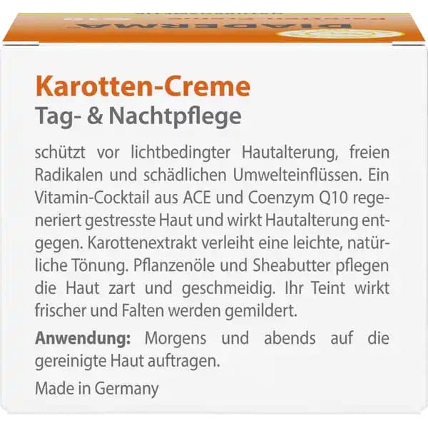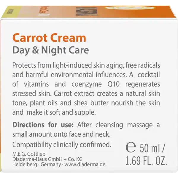 Schützt vor lichtbedingter Hautalterung, freien radikalen und schädlichen Umwelteinflüssen. Ein Vitamin-Cocktail aus ACE und Coenzym Q10 regeneriertgestresste Haut und wirkt Hautalterung entgegen. Karottenextrakt verleiht eine leichte, natürliche Tönung. Pflanzenöle und Sheabutter pflegen die Haut zart und geschmeidig. Ihr Teint wirkt frischer und Falten werden gemildert. Der Vitamin-Cocktail bei müder& fahler Haut!