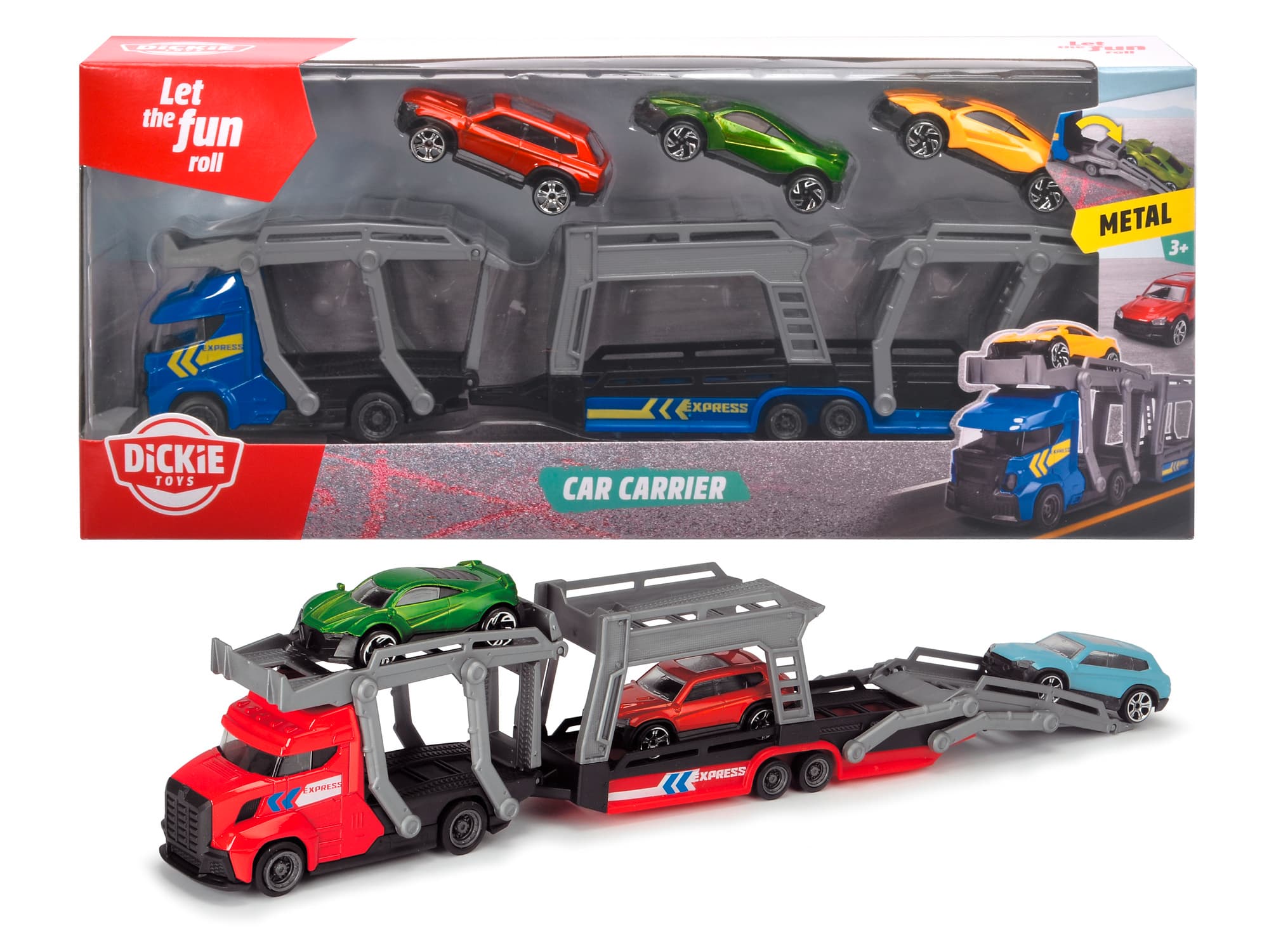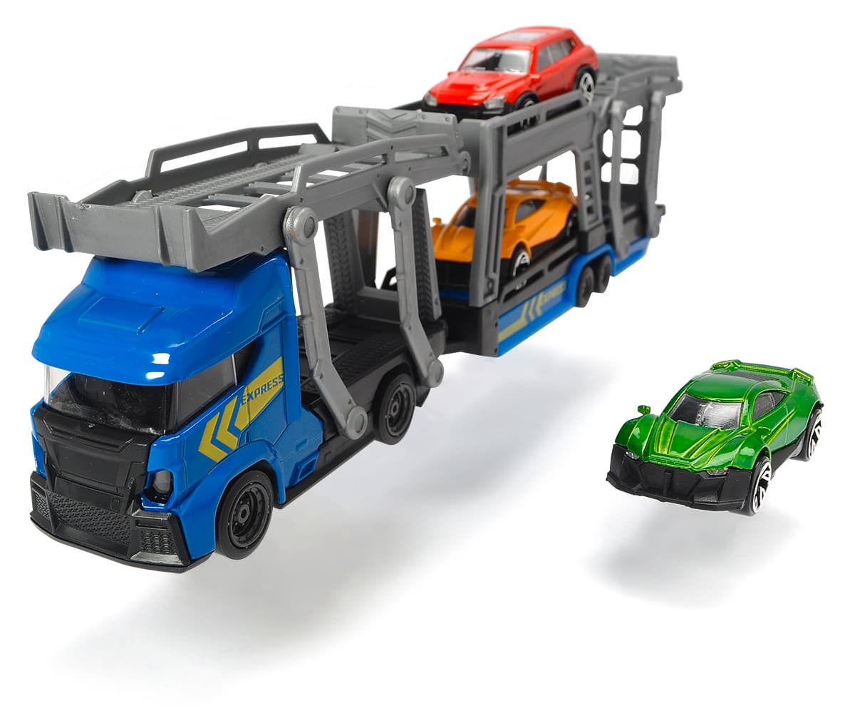 Achtung, Achtung: Schwere Lasten auf der Autobahn! Ein Autotransporter sorgt auf der Straße immer für große Augen. Der Freilauf Car Transporter von Dickie Toys ist für die Beförderung vier neuer PKWs zuständig. Durch die beweglichen Teile ist der Spielspaß für Kinder ab dem dritten Lebensjahr garantiert. Mit seinen 28 cm Länge passt er definitiv in jedes Spielzimmer und lässt Kinder Straßenszenen 1:1 nachspielen.
