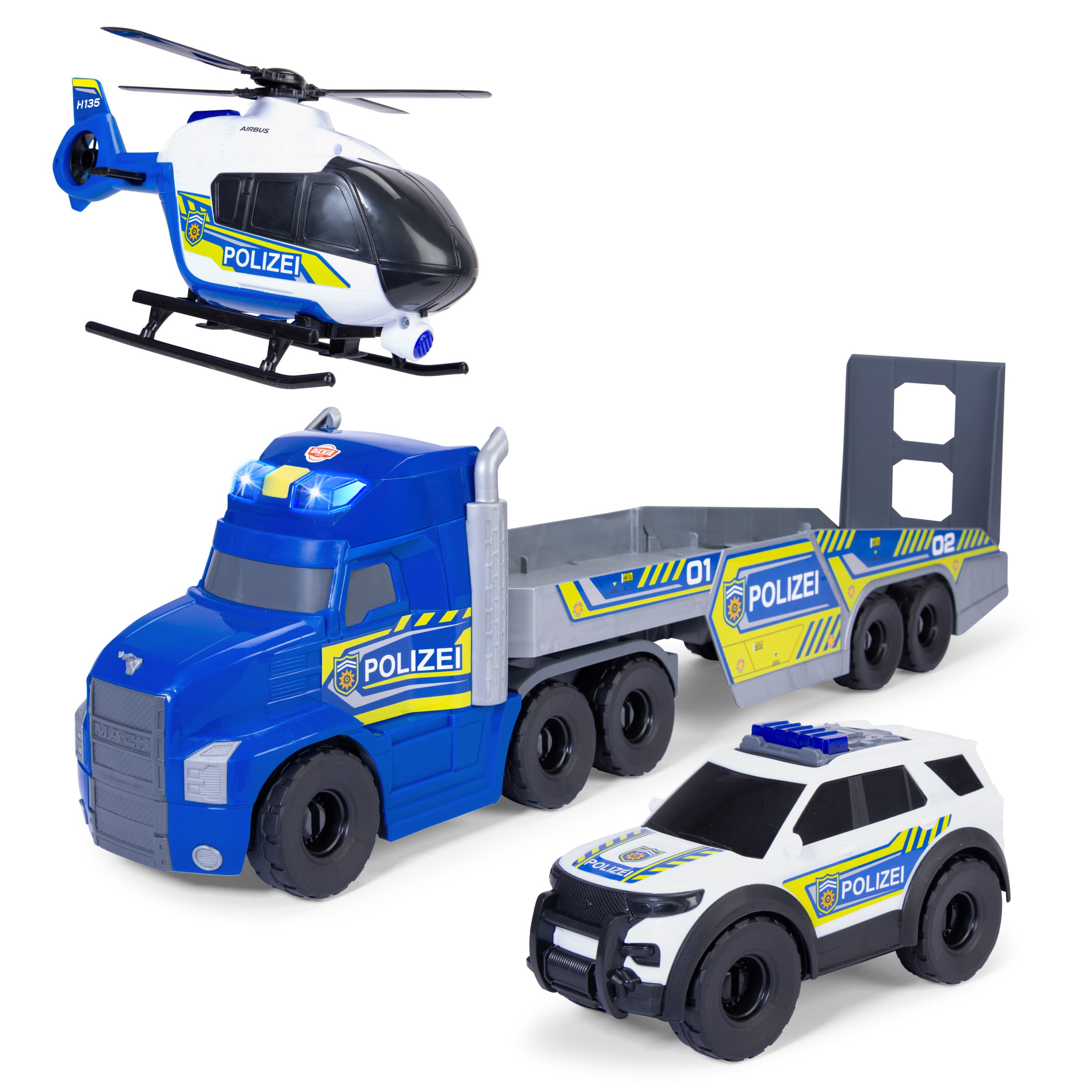 •Mutige Sondereinheit - Kein Einsatz ist ihnen zu schwer: Das Giant Police Truck Spielzeug-Set enthält einen Mack Anthem Truck mit Auflieger, einen Airbus H135 Helikopter und einen Ford Interceptor SUV.