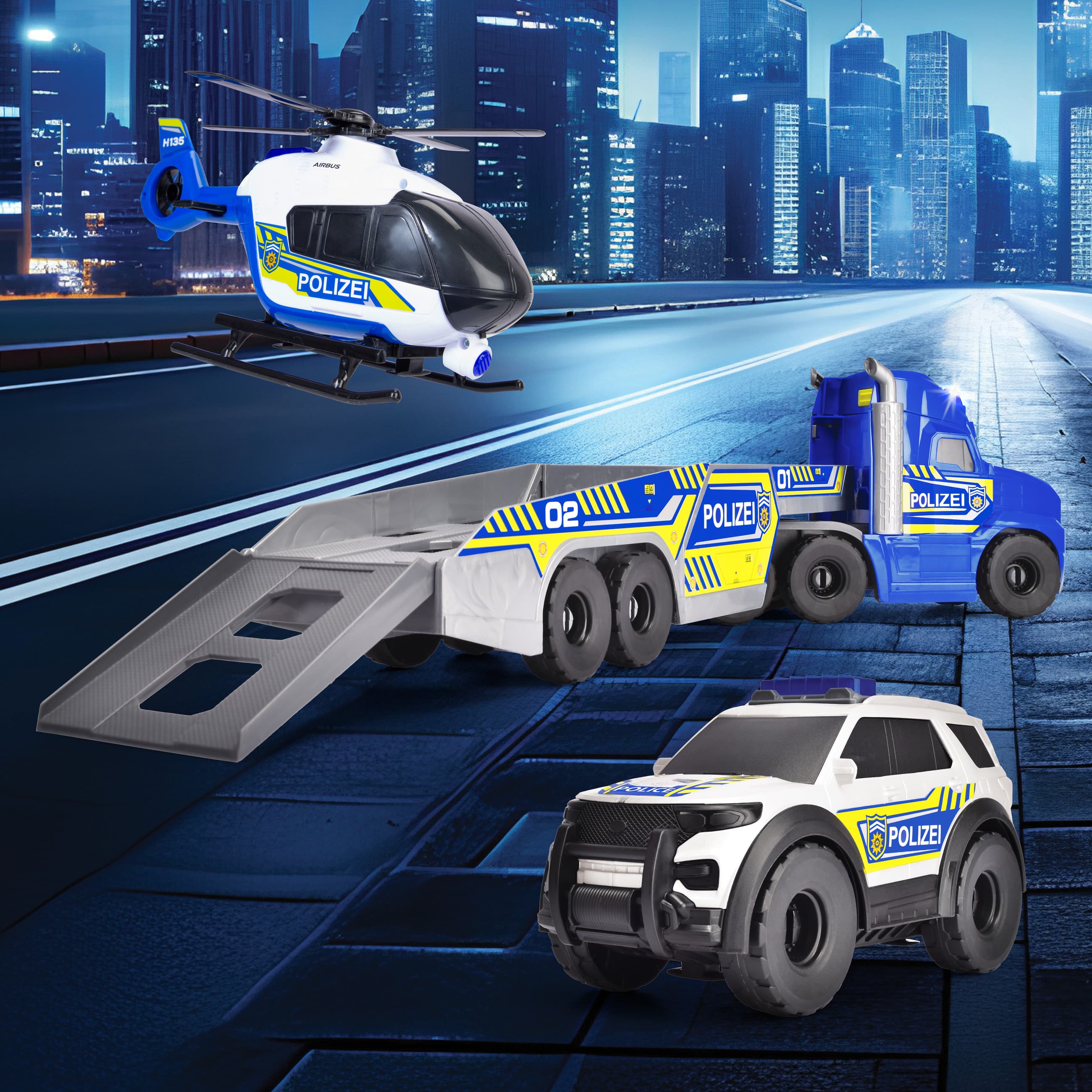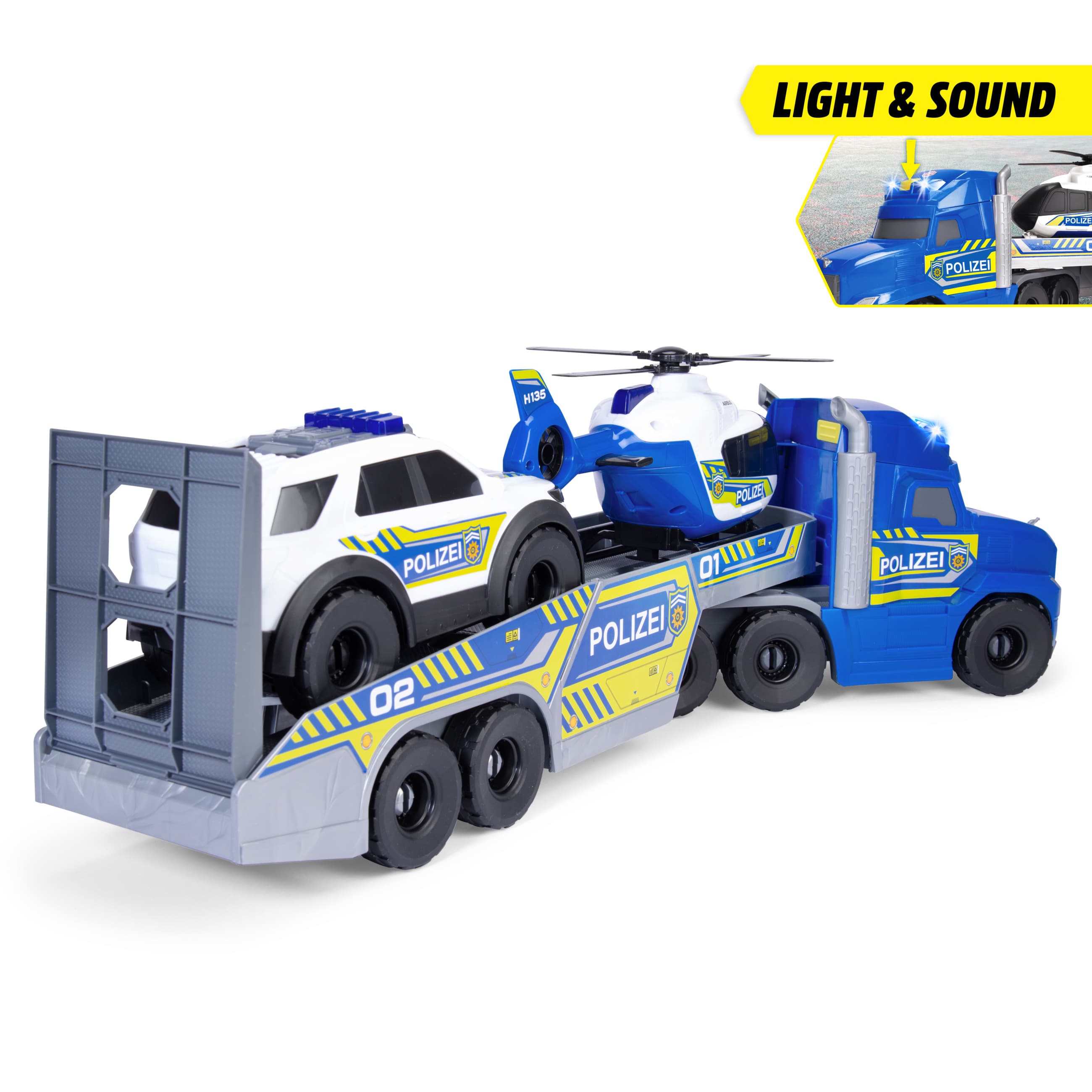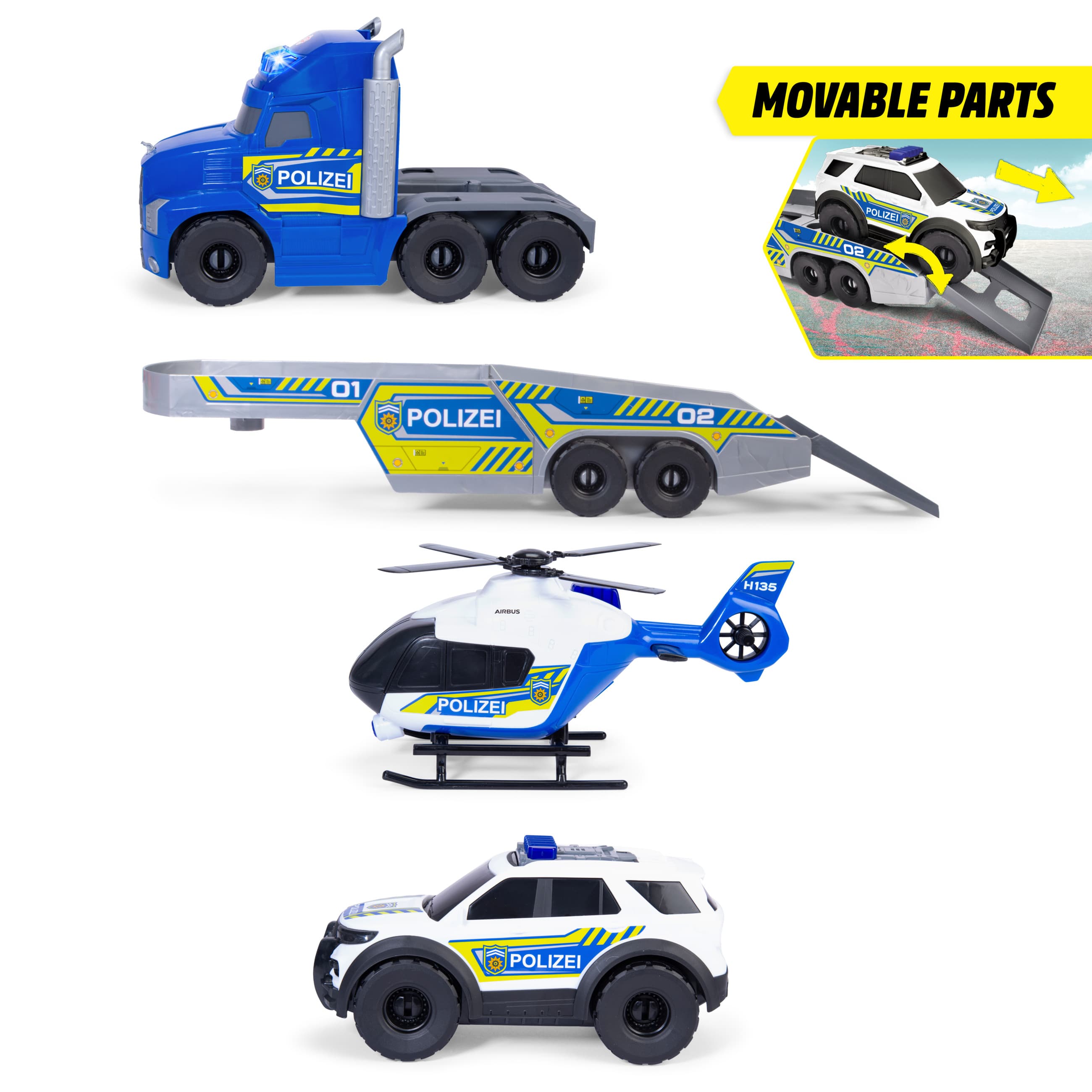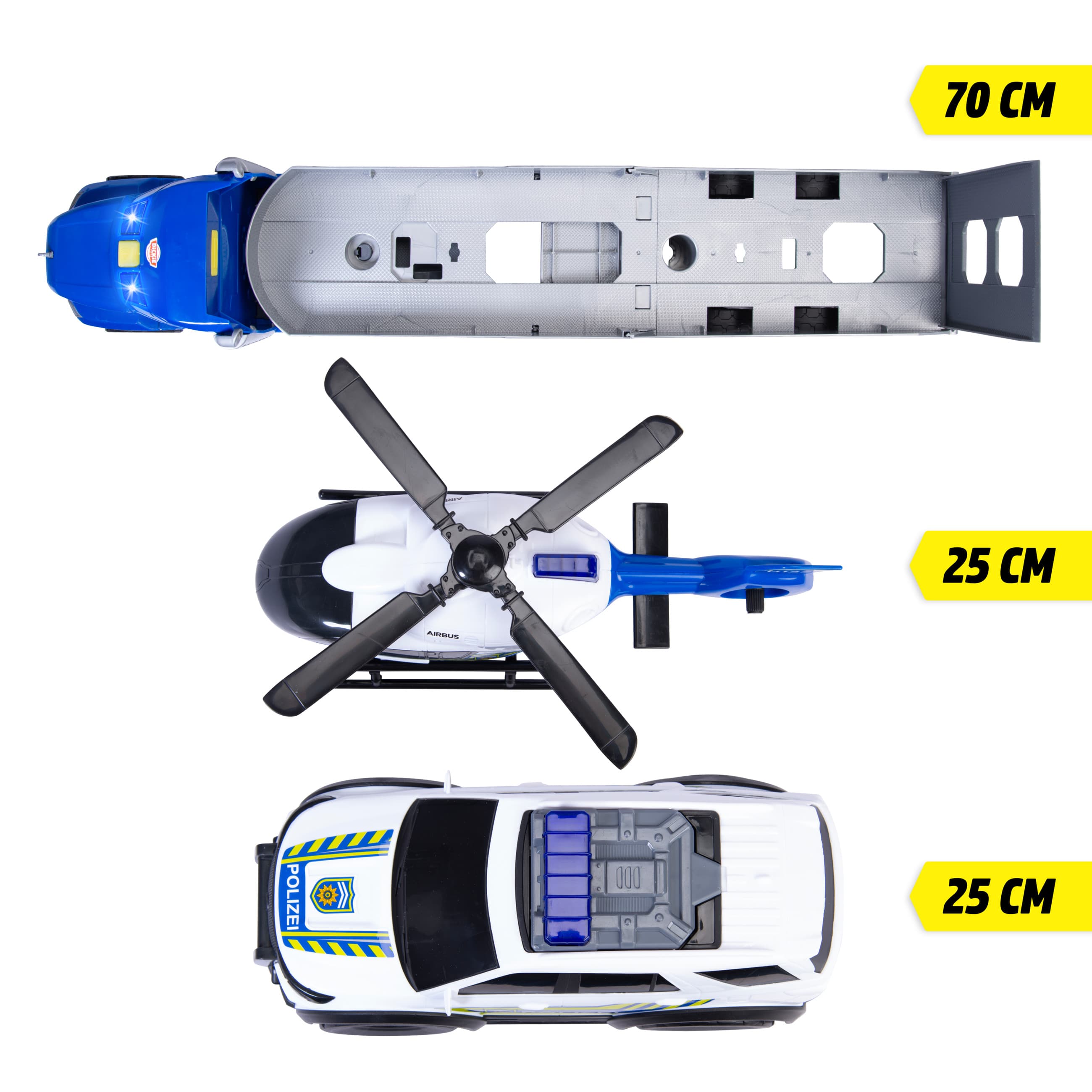 •Detailreiche Einsatzfahrzeuge - Der 70 cm lange Transporter bringt den Hubschrauber und das Auto schnell zum Zielort. Alle Fahrzeuge sind offiziell lizenziert und mit realistischen Details ausgestattet.