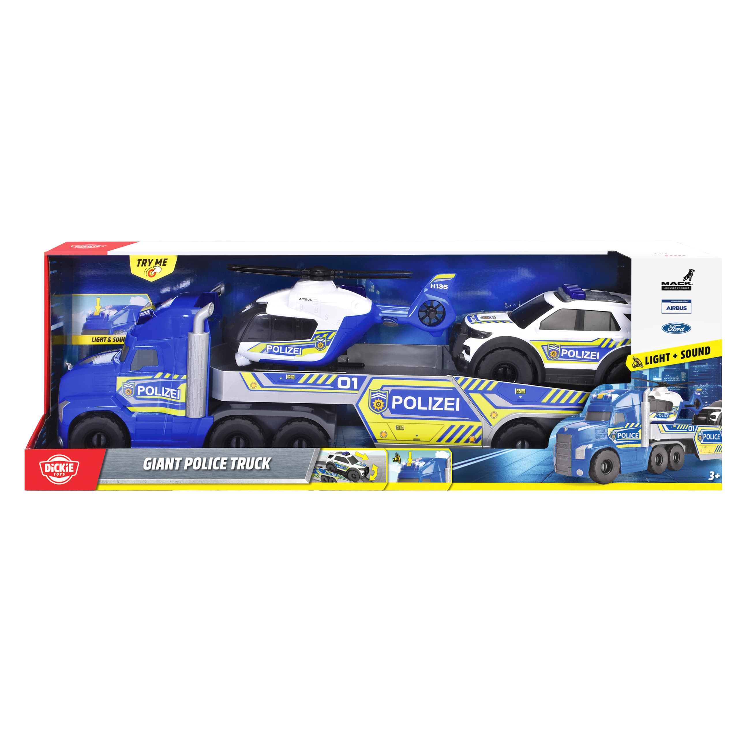 Mit dem Dickie Toys Giant Police Truck rollt ein kompletter Einsatztrupp ins Kinderzimmer – denn der große Mack Anthem Truck bringt gleich zwei starke Partner mit: einen robusten Ford Interceptor Geländewagen und einen Airbus H135 Helikopter. Ob zur Unterstützung der Polizei und Feuerwehr oder für geheime Sondermissionen: Dieses Power-Trio sorgt für Abwechslung, Spannung und stundenlangen Spielspaß. Die beiden Spielzeugautos verfügen über Freilauf und sind auch einzeln bespielbar – genauso wie der einsatzbereite Hubschrauber mit drehbarem Propeller.