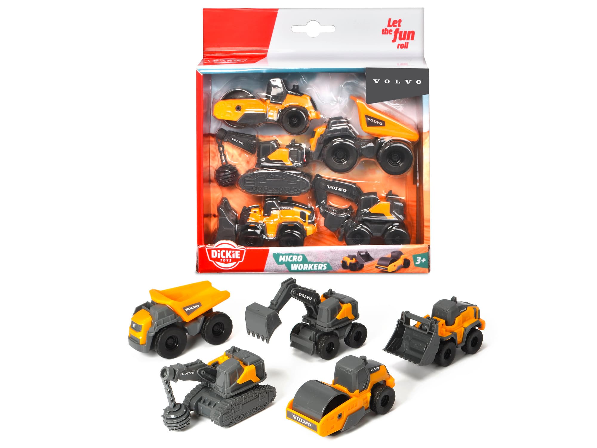 Dickie Toys Volvo Micro Workers: schweres Gerät für schwere AufgabenMit den Dickie Toys Volvo Micro Workers werden schwere Aufgaben auf der Baustelle in der Spielzeugstadt jetzt ganz einfach: Denn Walze, Abrissfahrzeug, Radlader, Bagger und Muldenkipper in diesem fünfteiligen Set packen das!Die Spielzeugautos mit Freilauf wurden detailgetreu in Lizenz nach den originalen Volvo-Vorbildern gestaltet. Jedes Fahrzeug verfügt über typische bewegliche Teile: Die Rolle der Walze dreht sich, die Abrissbirne schwingt hin und her, Radlader und Bagger verfügen über eine bewegliche Schaufel und der Muldenkipper hat eine kippbare Ladefläche.Dieses Set mit einer Fahrzeuglänge von jeweils 10 cm ist eine tolle Geschenkidee für Baumeister ab drei Jahren.• Spielzeugautos mit Freilauf im 5er-Set• Lizenz: Volvo• Walze, Abrissfahrzeug, Radlader, Bagger, Muldenkipper• zum Fahrzeugtyp passende bewegliche Teile• Länge: 10 cm• Altersempfehlung: ab 3 Jahren