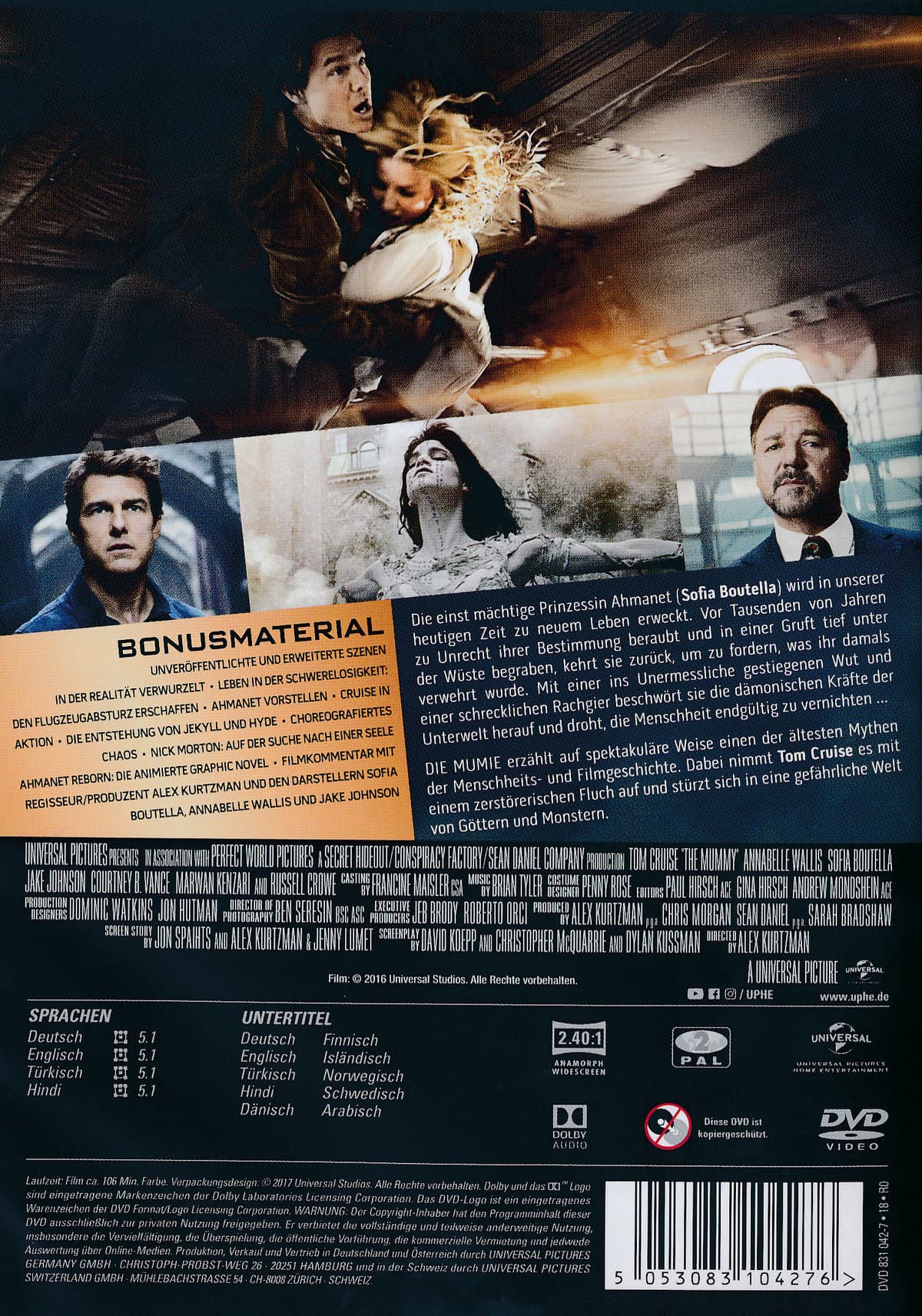 | Zusatzinfos / Bonusmaterial beim Film dabei | Unveröffentlichte und Erweiterte Szenen; In der Realität verwurzelt; Leben in der Schwerelosigkeit: Den Flugzeugabsturz erschaffen; Ahmanet vorstellen; Cruise in Aktion; Die Entstehung von Jekyll und Hyde; Choreografiertes Chaos; Nick Morton: Auf der Suche nach einer Seele; Ahmanet Reborn: Die animierte Graphic Novel; Filmkommentar mit Regisseur/Produzent Alex Kurtzman und den Darstellern Sofia Boutella, Annabelle Wallis und Jake Johnson; |