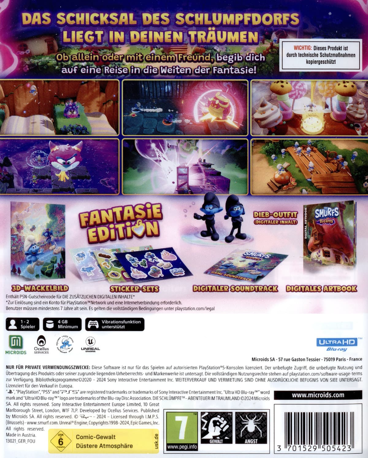 Die Schlümpfe - Abenteuer im Traumland Dieses 3D-Plattformspiel bietet unglaublich spannende Herausforderungen und verblüffende Rätsel und erschafft eine völlig immersive magische Welt, in der die Fantasie zum Leben erweckt wird. Entdecke alleine oder mit einem Freund bezaubernde Orte und erforsche die Träume deiner Lieblingsschlümpfe. Jeder Traum ist ein einzigartiges Abenteuer mit seinem eigenen Gameplay. Gargamel hat einen neuen bösen Plan ausgeheckt, um die Schlümpfe zu fangen. Sein Unhold hat die Sarsaparilla-Büsche mit einem listigen Fluch belegt, sodass die Schlümpfe in einen tiefen Schlaf fallen, wenn sie die köstlichen Blätter essen. Begib dich auf eine traumhafte Suche, um alle Schlümpfe zu erwecken, bevor der böse Gargamel das Dorf erreicht! Diese epische Reise entführt dich in ein ebenso spannendes wie unvorhersehbares Spielerlebnis - in der Traumwelt kann die Aufregung jeden Moment schnell in einen Albtraum umschlagen. FEATAURES • Ein schlumpftastisches 2-Spieler-Erlebnis: vereitle alleine oder zu zweit Gargamels böse Pläne! • Begib dich auf ein Abenteuer: Entdecke 4 verschiedene Traumwelten mit 12 Levels und 16 Mini-Levels und erfahre die Geheimnisse des Schlumpfdorfs. • Tauche ein in die Fantasie der Schlümpfe: Jeder Traum bietet ein einzigartiges Abenteuer mit eigenem Zubehör, Puzzles und Überraschungen. • Eine magische Welt: Entdecke ein einzigartiges Game-Design, das sich entwickelt, während du verschiedene Träume erkundest. Die Schlümpfe - Abenteuer im Traumland - Fantasie Edition enthält: • Das komplette Spiel • 3D-Wackelbild • Sticker-Set • Dieb-Outfit (digitaler Zusatzinhalt) • Artbook (digitaler Zusatzinhalt) • Soundtrack (digitaler Zusatzinhalt) (DLC's bei Neukauf enthalten, einmalig verwendbar)