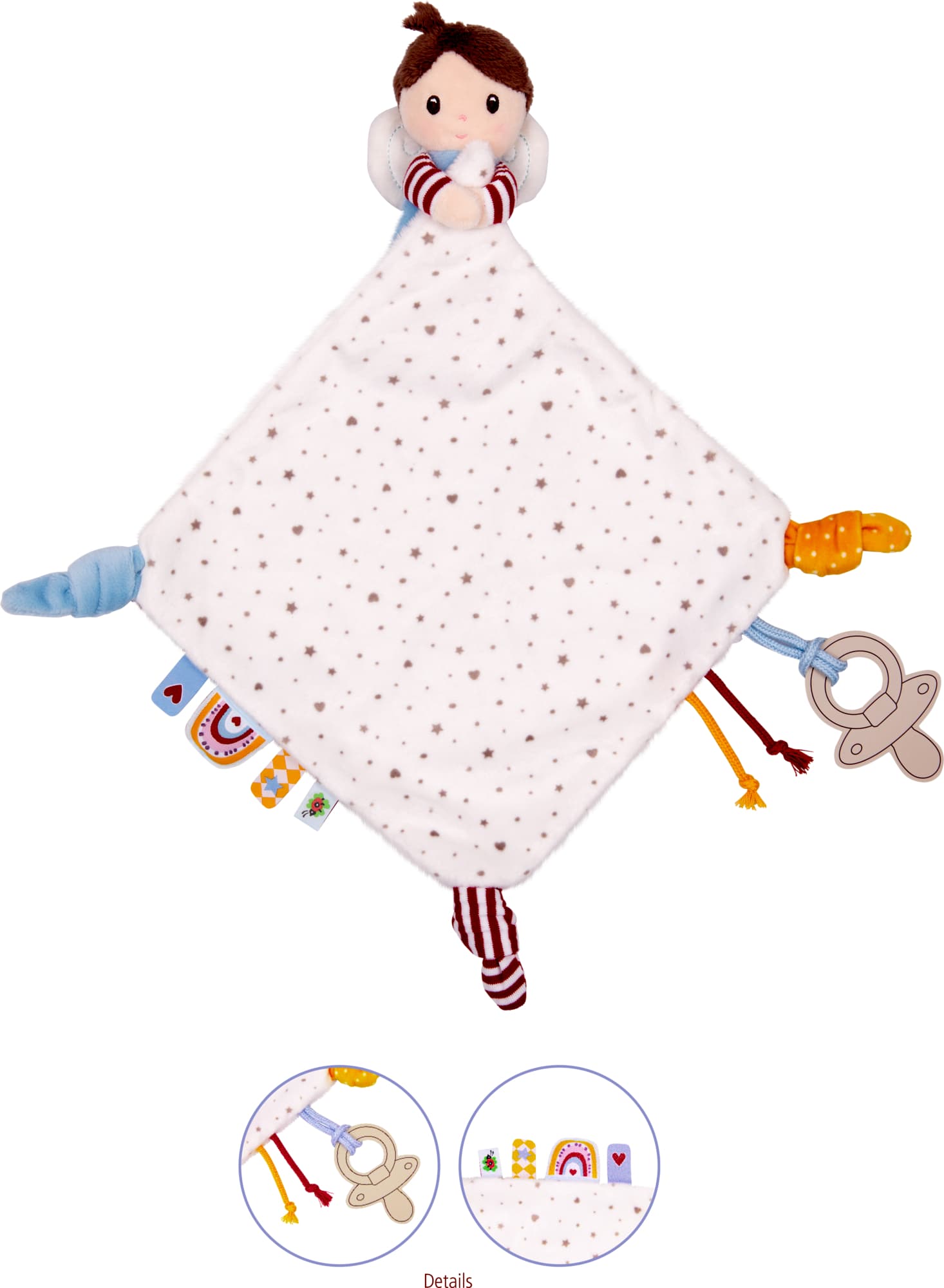 Liebevoll. Das besondere Etwas. Trendiges Design. Hochwertige Materialien. Spielsachen, die Kindern Spaß machen. Geschenkideen zu jedem Anlass… all das ist BabyGlück.Das Schnullertuch von Die Spiegelburg ist der ideale Begleiter für die Kleinsten und sorgt für beruhigende Momente im Alltag. Mit großzügigen Maßen von ca. 34 x 35 cm und aus kuschelweichem Material gefertigt, bietet es Babys Geborgenheit und Wohlgefühl. Das liebevolle Schutzengel-Motiv und verschiedene Fühlelemente laden zum Entdecken und Greifen ein und wecken sanft Babys Neugier. Besonders praktisch: Der Schnuller kann mit einer Schlaufe sicher am Schnuffeltuch befestigt werden und ist somit immer griffbereit. Das Tuch ist waschbar bei 30 Grad und somit einfach zu reinigen – ideal für den täglichen Einsatz. Egal ob zur Geburt, zur Taufe oder zum ersten Geburtstag: für (werdende) Eltern, Großeltern und Freunde, die auf der Suche nach einer langlebigen Geschenkidee sind, ist BabyGlück die perfekte Wahl.