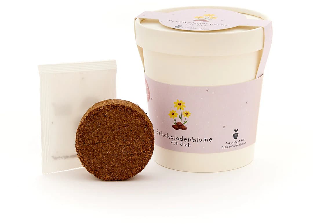 • Das Set enthält Schokoblumen-Saatgut, eine Kokos-Quelltablette, einen Anzuchtbecher und eine Anleitung. In nur wenigen Schritten wächst aus dem Set ein kakaoduftender Blütengruß – auf der Fensterbank, im Büro oder auf dem Balkon.