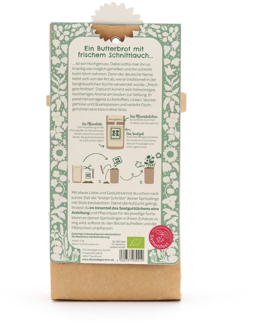 - Die Schnittlauch-Samen in BIO-Qualität sind ungebeizt, frei von Chemie und nicht genmanipuliert. Das ist gut für die Umwelt und sorgt für eine hohe Keimfähigkeit. Ideal für die Anzucht zuhause auf der Fensterbank, dem Balkon oder im Topf im Gewächshaus.