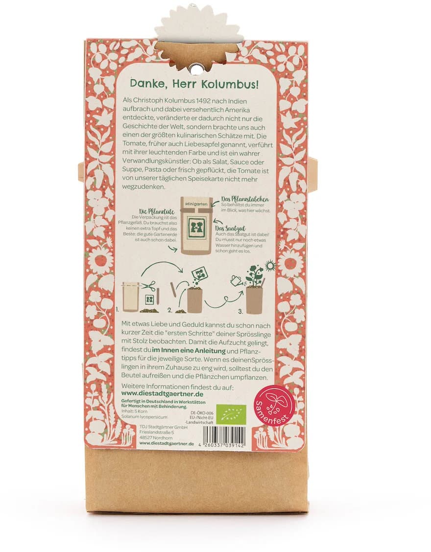 • Enthält keimfreudiges BIO-Saatgut für Wildtomaten, hochwertige Anzuchterde, ein passendes Pflanzstäbchen bzw. Beetmarkierer sowie eine wasserfeste Verpackung, die als Pflanzgefäß genutzt wird. Mit der ausführlichen und anfängerfreundlichen Anleitung funktioniert die Anzucht kinderleicht.