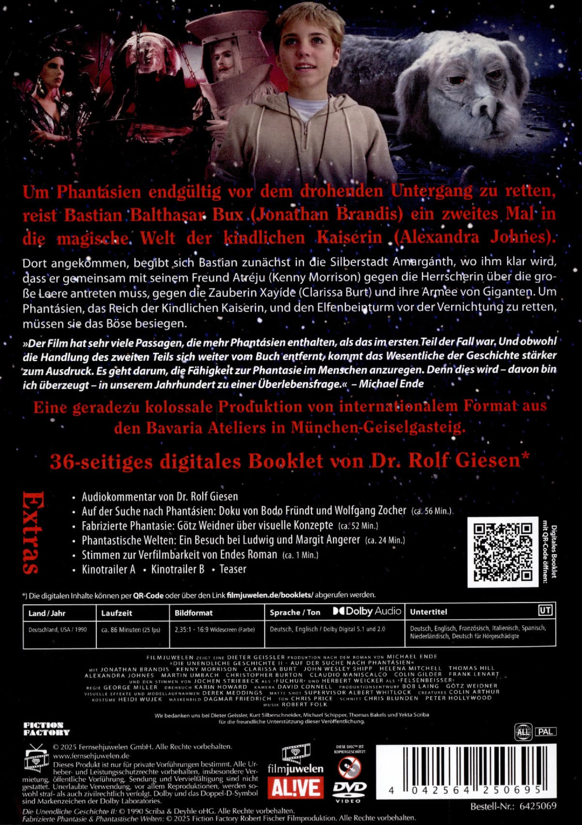 | Zusatzinfos / Bonusmaterial beim Film dabei | Digitales Booklet (online abrufbar); Audiokommentar von Dr. Rolf Giesen; Auf der Suche nach Phantásien: Doku von Bodo Fründt und Wolfgang Zocher (ca. 53 Min.); Fabrizierte Phantasie: Götz Weidner über visuelle Konzepte in Die unendliche Geschichte II (ca. 45 Min.); Phantastische Welten: Ein Besuch bei Ludwig und Margit Angerer (ca. 25 Min.); Stimmen zur Verfilmbarkeit von Endes Roman; Trailer; Teaser; Wendecover |