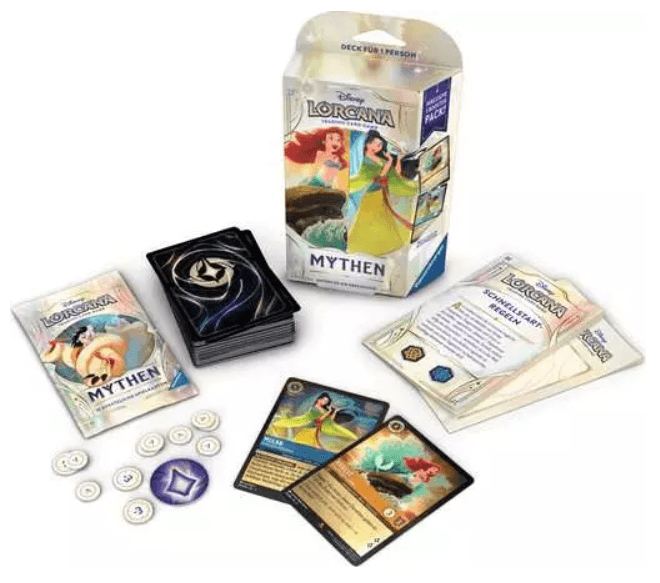 Die Disney Lorcana Einzelspieler Decks enthalten ein vorgefertigtes Deck (60 Karten) mit einem festgelegten Kartensatz. In einem Deck sind jeweils zwei Tintenfarben gemischt