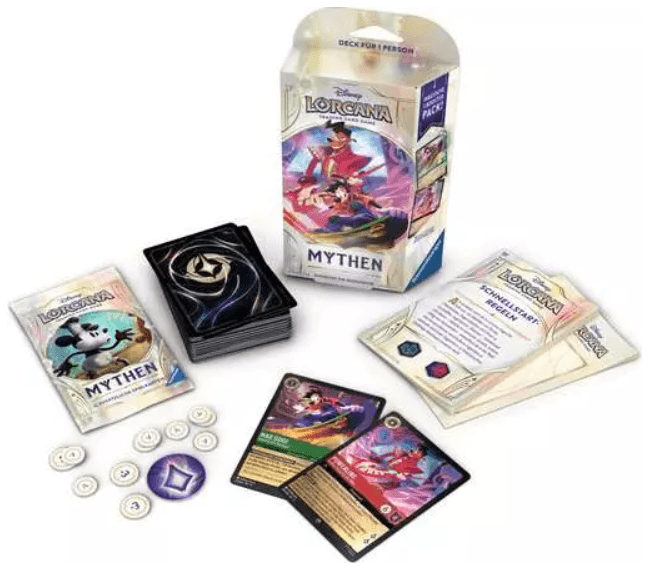 Die Disney Lorcana Einzelspieler Decks enthalten ein vorgefertigtes Deck (60 Karten) mit einem festgelegten Kartensatz. In einem Deck sind jeweils zwei Tintenfarben gemischt