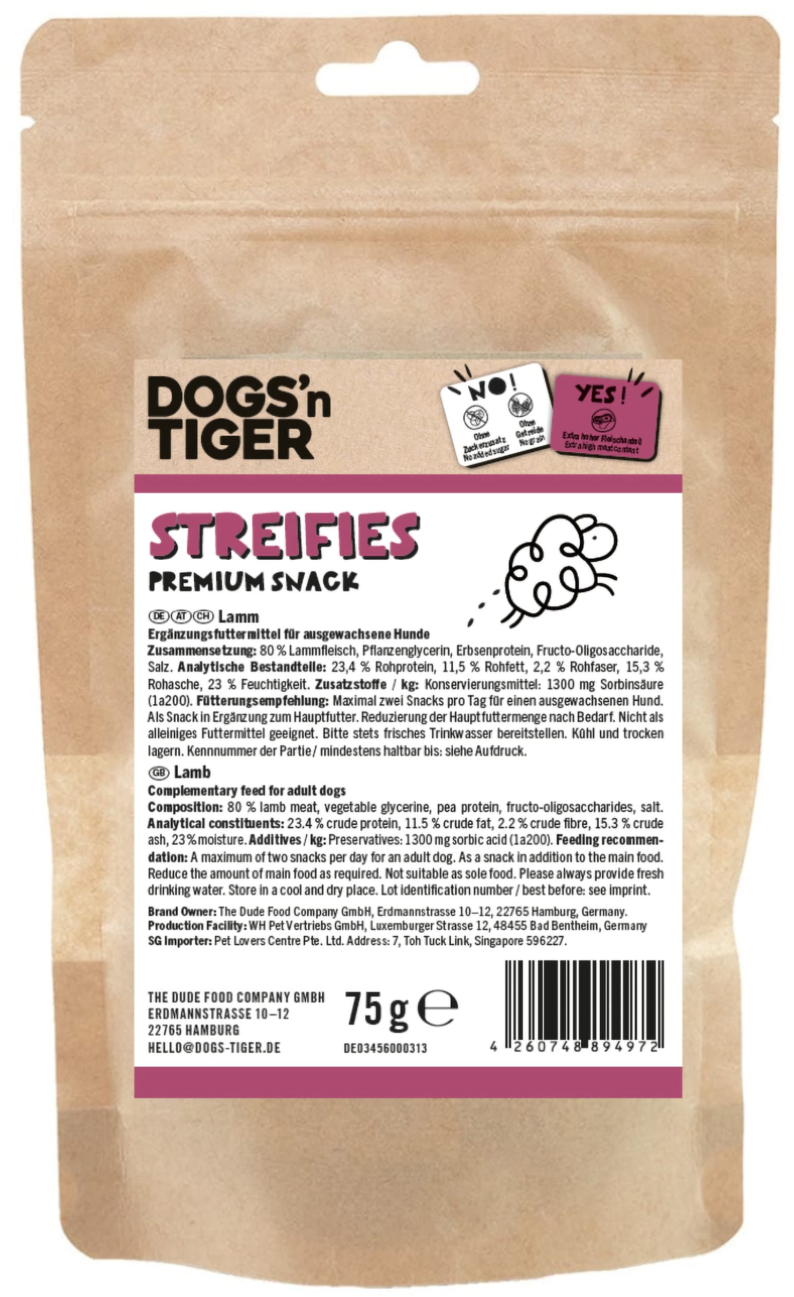 Mit unseren Streifies Lamm bekommt dein Hund pures Lammfleisch kombiniert mit prebiotischer Wirkung für eine gesunde Verdauung. Die langen, zarten Streifen bestehen aus 80% hochwertigem Lammfleisch und liefern leicht verdauliche Proteine sowie wichtige Nährstoffe wie Eisen, Zink und Vitamin B12 für starke Muskeln, Vitalität und ein gesundes Immunsystem. Die Snacks sind bewusst getreidefrei und ohne Zuckerzusatz – ideal für sensible Hunde und alle, die eine natürliche Belohnung suchen. Prebiotische Ballaststoffe unterstützen die Darmflora, fördern die Nährstoffaufnahme und sorgen für ein rundum gutes Bauchgefühl. Dank der schonenden Verarbeitung bleiben Geschmack und wertvolle Inhaltsstoffe optimal erhalten – ganz ohne künstliche Farb-, Aroma- oder Konservierungsstoffe. Ob beim Training, unterwegs oder einfach zwischendurch – Streifies Lamm ist der Snack, der Hunde glücklich macht, ihre Verdauung unterstützt und sie mit hochwertigen Nährstoffen versorgt. Mit Dogs’n Tiger entscheidest du dich für ehrliche Zutaten, artgerechte Ernährung und funktionale Snacks, die Genuss und Gesundheit perfekt verbinden.