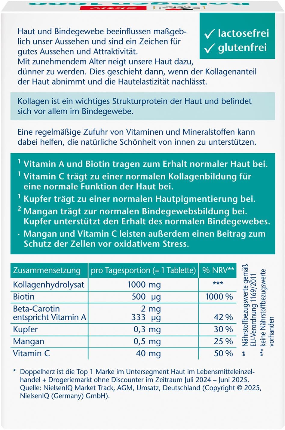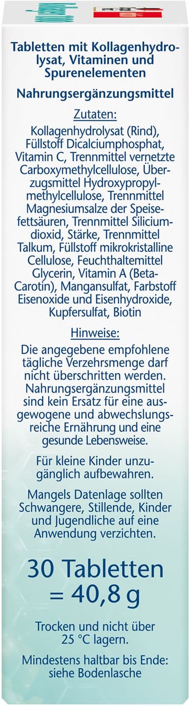 | Inhaltsstoffe | Kollagenhydrolysat (Rind), Füllstoff Dicalciumphosphat, Vitamin C, Trennmittel vernetzte Carboxymethylcellulose, Überzugsmittel Hydroxpropylmethylcellulose, Trennmittel Magnesiumsaltze der Speisefettsäuren, Trennmittel Siliciumdioxid, Stärke, Trennmittel Talkum, Füllstoff mikrokristalline Cellulose, Feuchthaltemittel Glycerin, Vitamin A (Beta-Carotin), Mangansulfat, Farbstoff Eiseoxide und Eisenhydroxide, Kupfersulfat, Biotin |