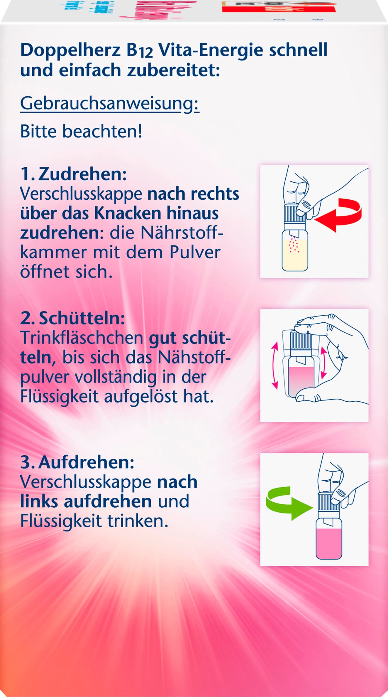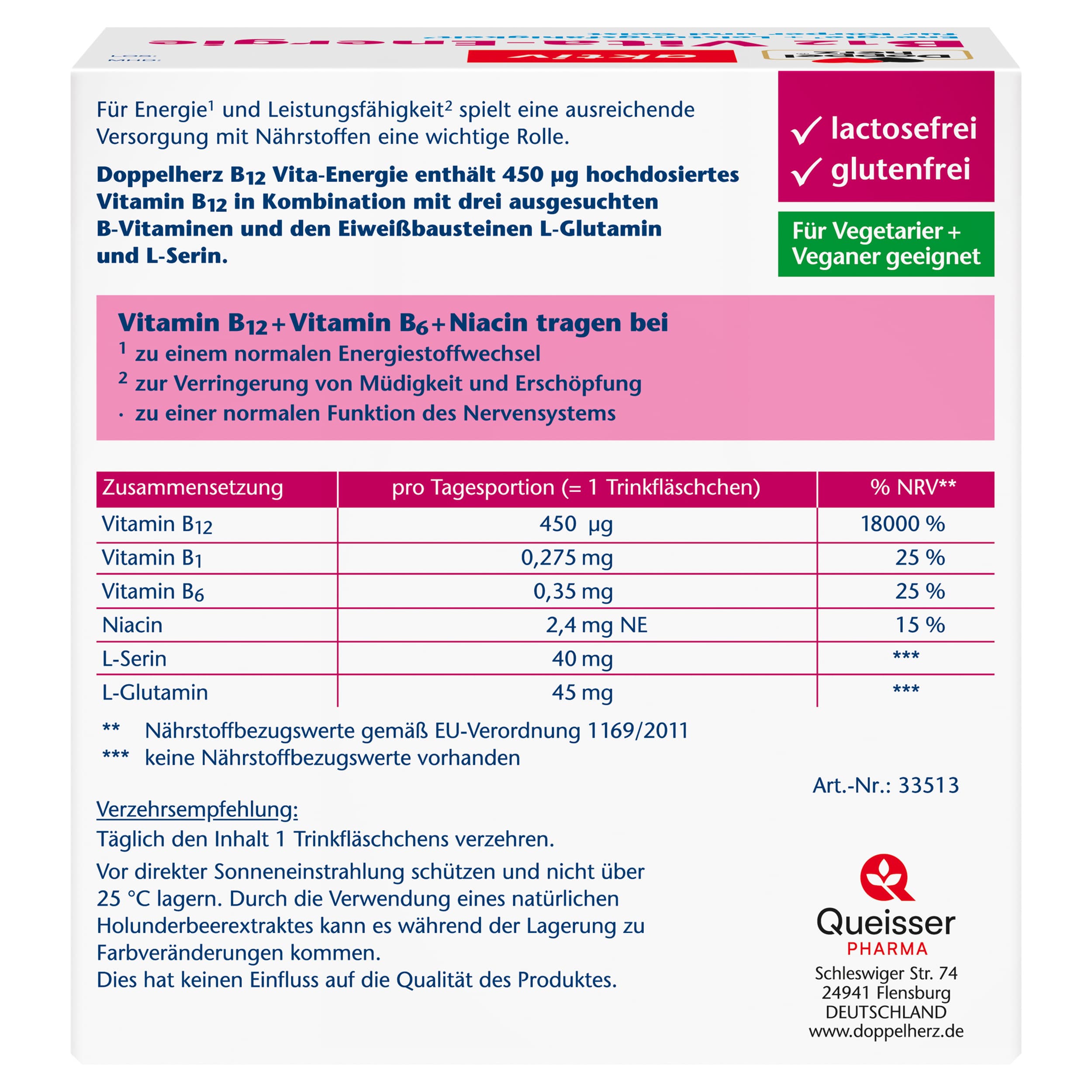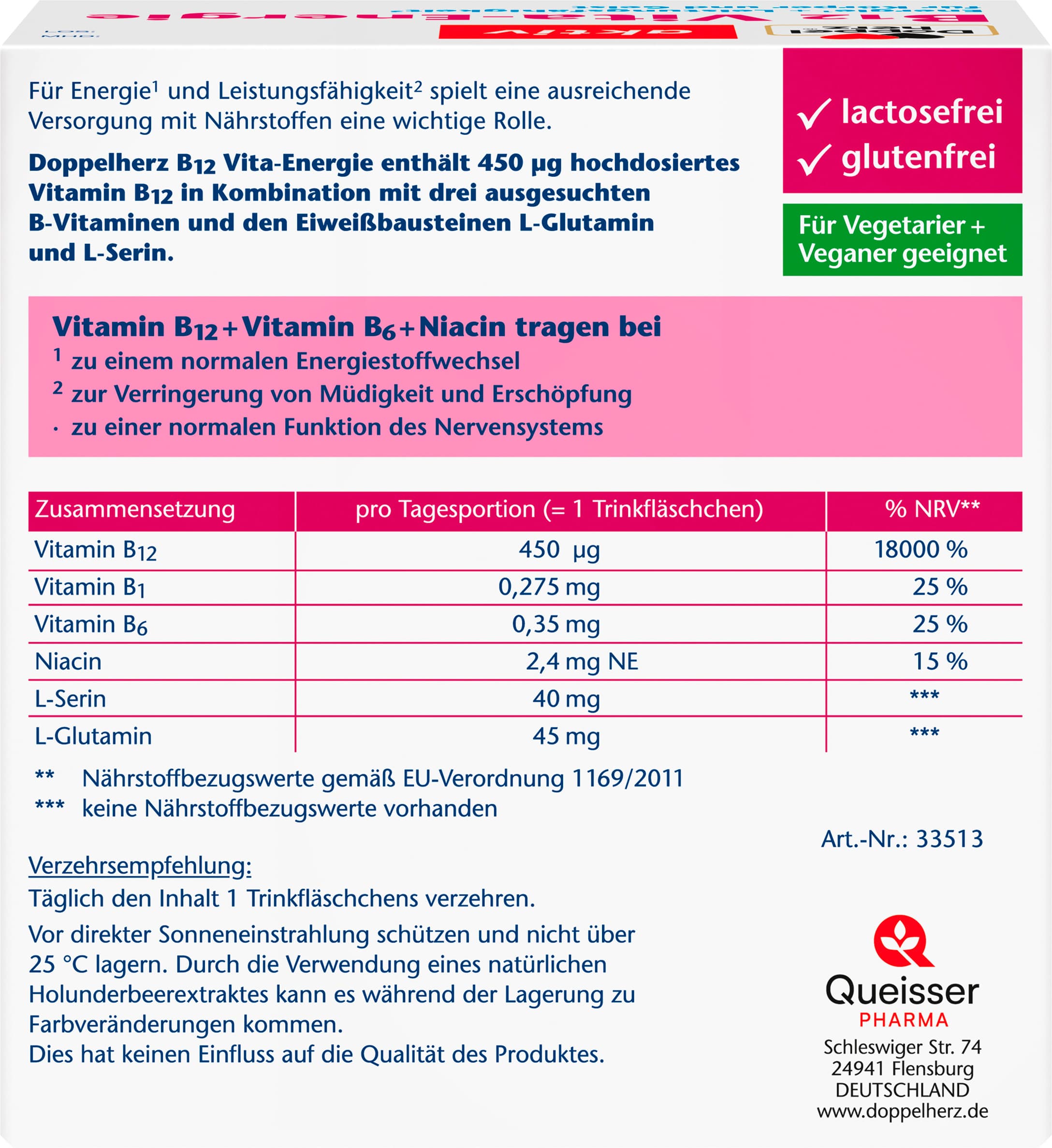 Für Energie (1) und Leistungsfähigkeit (2) spielt eine ausreichende Versorgung mit Nährstoffen eine wichtige Rolle. Doppelherz B12 Vita-Energie enthält 450 µg hochdosiertes Vitamin B12 in Kombination mit drei ausgesuchten B-Vitaminen und den Eiweißbausteinen L-Glutamin und L-Serin. (1) Vitamin B12+Vitamin B6+Niacin tragen bei zu einem normalen Energiestoffwechsel. (2) Vitamin B12+Vitamin B6+Niacin tragen bei zur Verringerung von Müdigkeit und Erschöpfung.