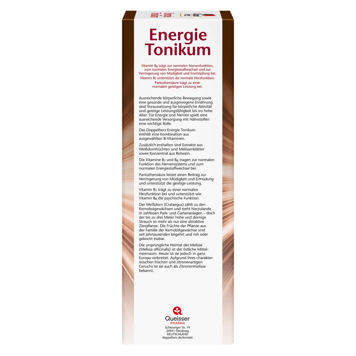 Nahrungsergänzungsmittel: Das Doppelherz Energie Tonikum enthält eine Kombination aus ausgewählten B-Vitaminen. Zusätzlich enthalten sind Extrakte aus Weißdornfrüchten und Melissenblätter sowie Konzentrat aus Rotwein. Die Vitamine B1 und B6 tragen zur normalen Funktion des Nervensystems und zum normalen Energiestoffwechsel bei. Pantothensäure leistet einen Beitrag zur Verringerung von Müdigkeit und Ermüdung und unterstützt die geistige Leistung. Vitamin B1 trägt zu einer normalen Herzfunktion bei und unterstützt wie Vitamin B6 die psychische Funktion. Der Weißdorn (Crataegus) zählt zu den Kernobstgewächsen und steht hierzulande in zahllosen Park- und Gartenanlagen – doch der bis zu drei Meter hohe und dornige Strauch ist mehr als nur eine attraktive Zierpflanze. Die Früchte der Pflanze aus der Familie der Kernobstgewächse sind seit Jahrtausenden begehrt und roh oder gekocht essbar. Die ursprüngliche Heimat der Melisse (Melissa officinalis) ist der östliche Mittelmeerraum. Heute ist sie jedoch in ganz Europa verbreitet. Aufgrund ihres charakteristischen frischen und zitronenartigen Geruchs ist sie auch als Zitronenmelisse bekannt.