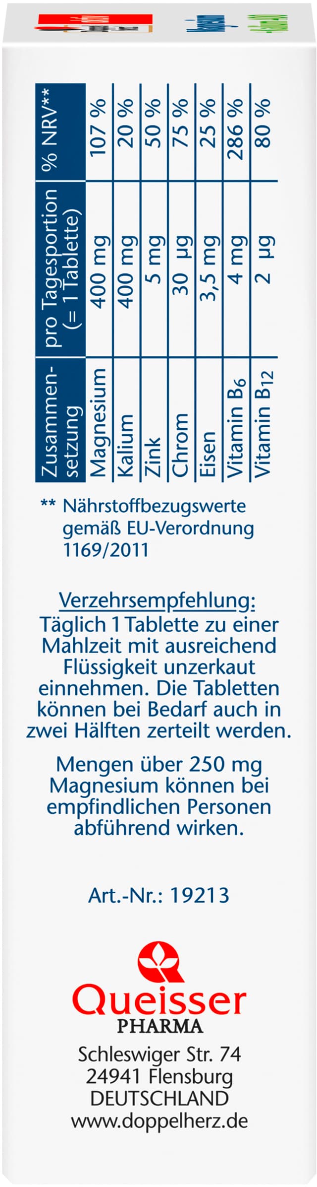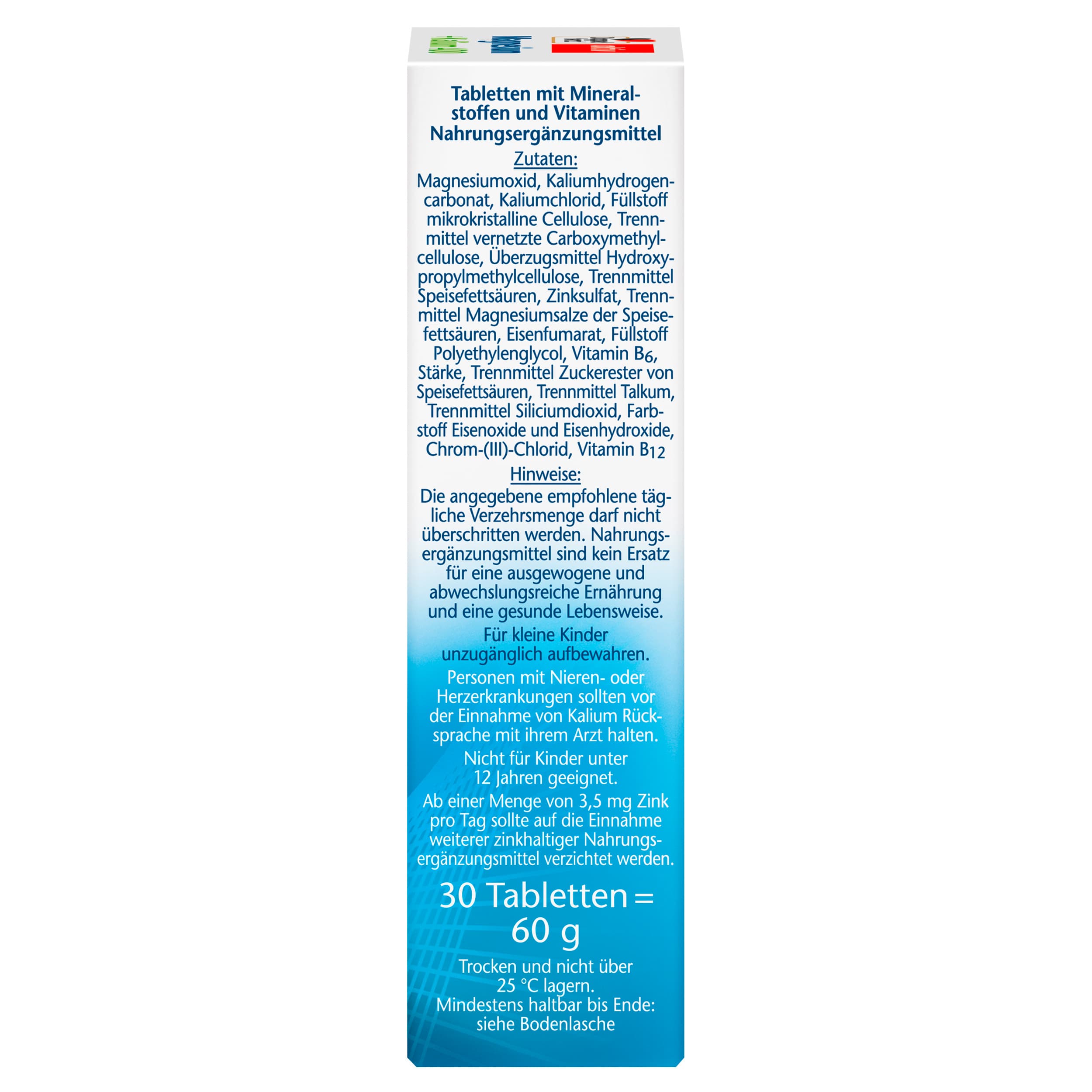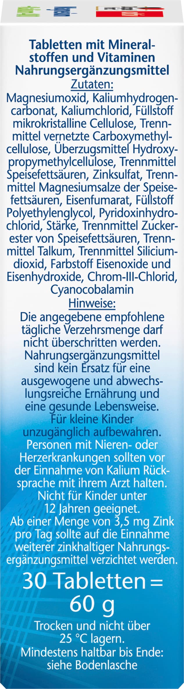 | Zutaten | Magnesiumoxid, Kaliumhydrogencarbonat, Kaliumchlorid, Füllstoff mikrokristalline Cellulose, Trennmittel vernetzte Carboxymethylcellulose, Überzugsmittel Hydroxypropylmethylcellulose, Trennmittel Speisefettsäuren, Zinksulfat, Trennmittel Magnesiumsalze der Speisefettsäuren, Eisenfumarat, Füllstoff Polyethylenglycol, Pyridoxinhydrochlorid, Stärke, Trennmittel Zuckerester von Speisefettsäuren, Trennmittel Talkum, Trennmittel Siliciumdioxid, Farbstoff Eisenoxide und Eisenhydroxide, Chrom-III-Chlorid, Cyanocobalamin |
