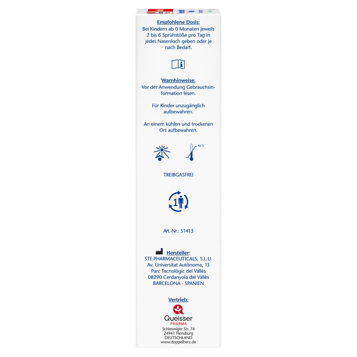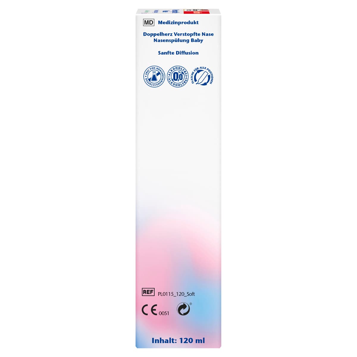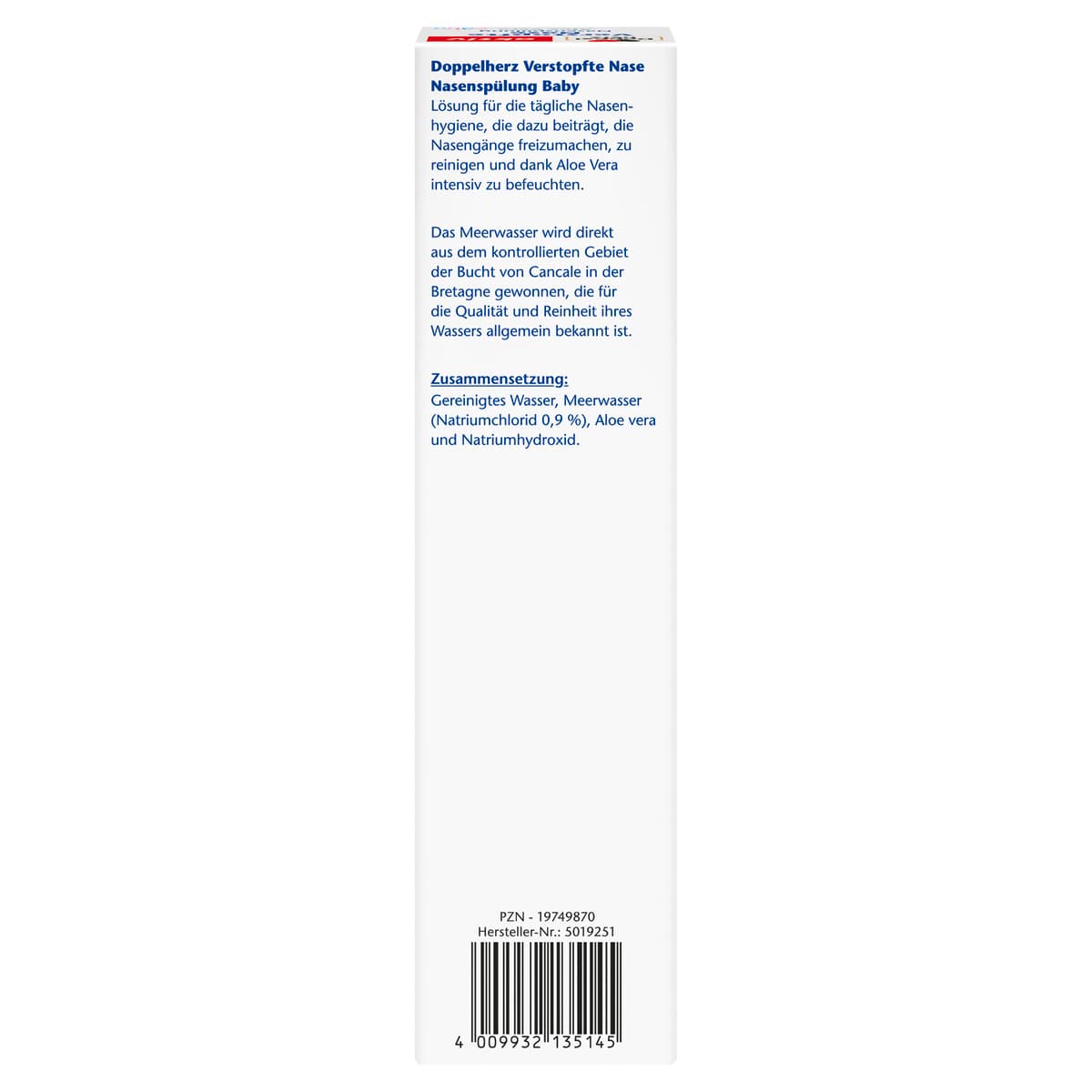 Doppelherz Verstopfte Nase Nasenspülung Baby ist ein treibgasfreies Nasenspray auf Basis einer isotonischen Meerwasserlösung (0,9 % Natriumchlorid) mit natürlichen Meeresmineralien und Spurenelementen sowie natürlichem Aloe-Vera-Extrakt.