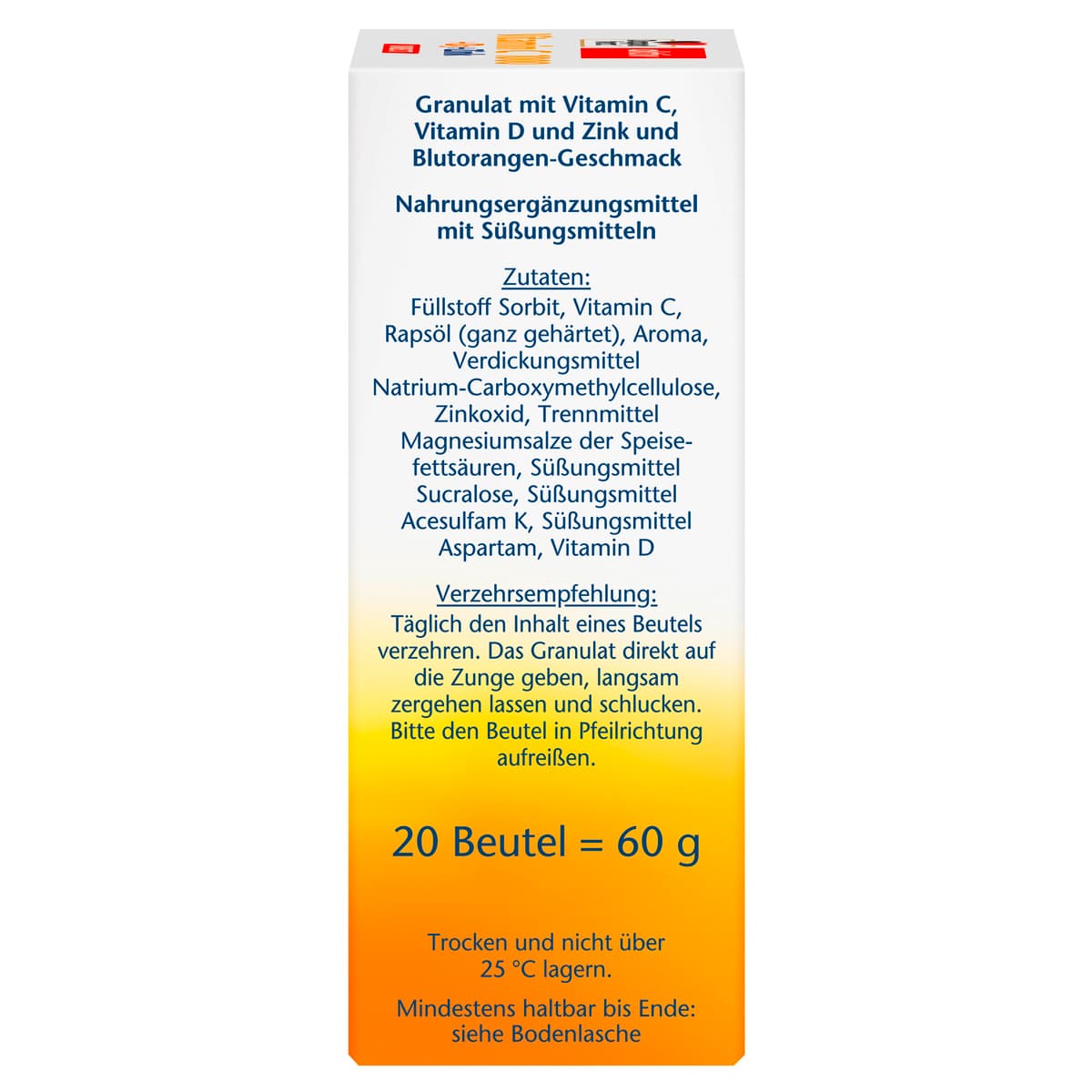 | Anwendungshinweis | Täglich den Inhalt eines Beutels verzehren. Das Granulat direkt auf die Zunge geben, langsam zergehen lassen und schlucken. Bitte den Beutel in Pfeilrichtung aufreißen. |
