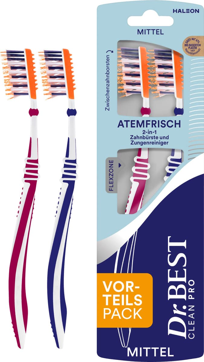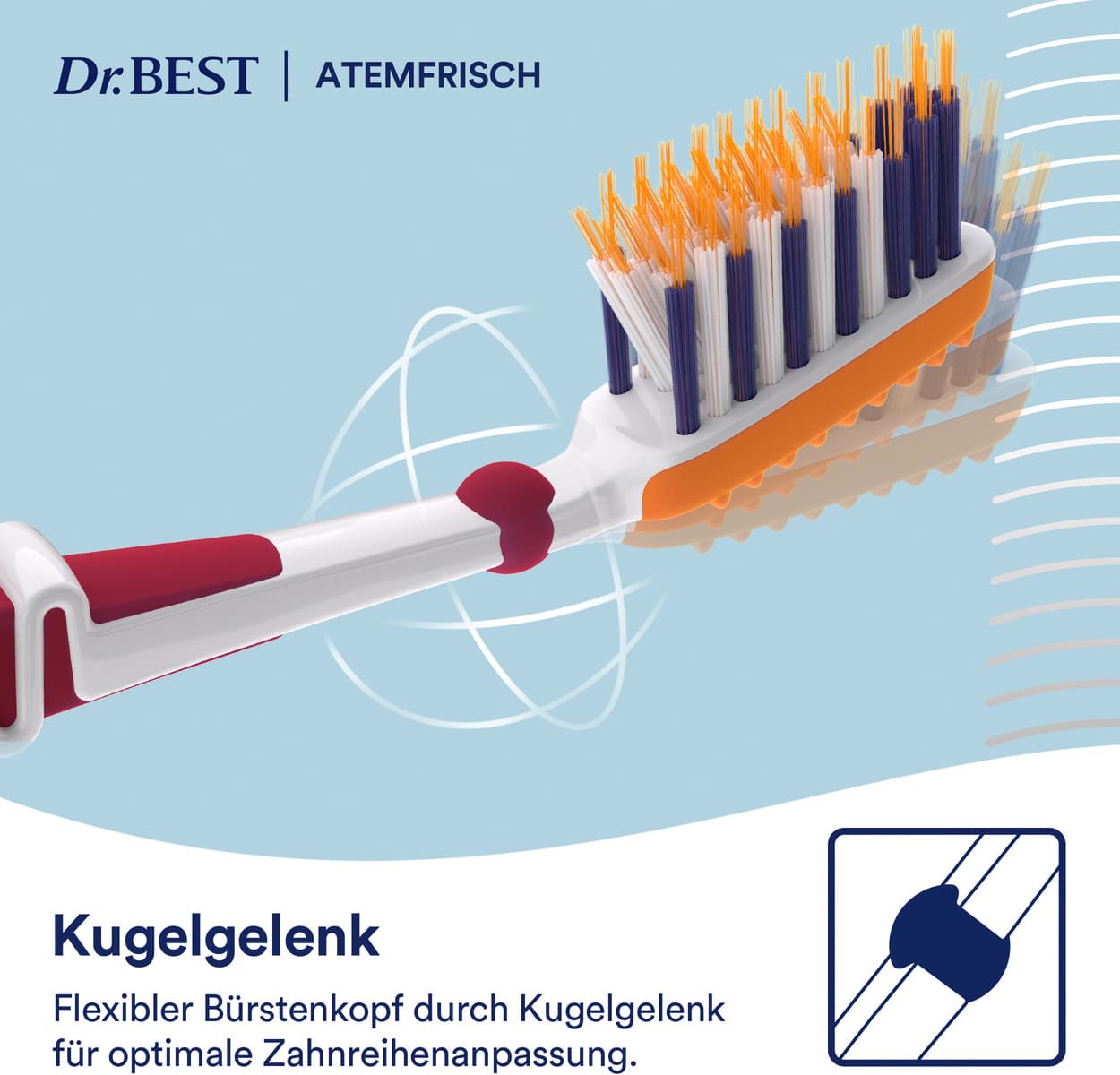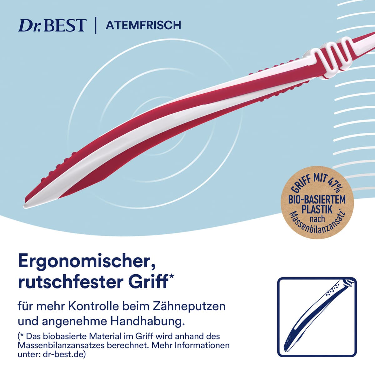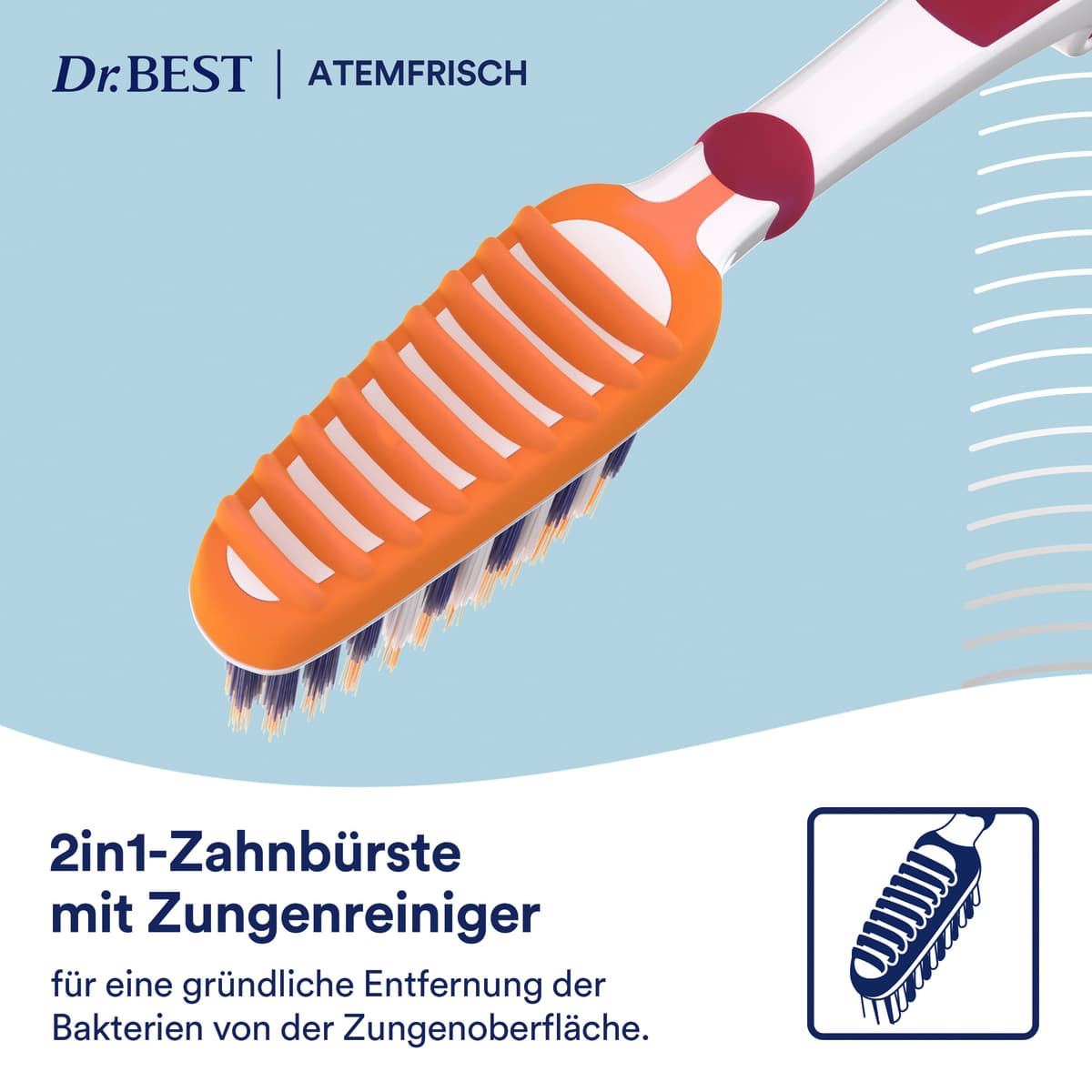 Bakterien sind eine der Hauptursachen für schlechten Atem. Diese Bakterien befinden sich an schwer erreichbaren Stellen, wie zwischen den Zähnen und auf der Zunge. Die Dr.BEST Atemfrisch wurde entwickelt, um mit ihrem Zungenreiniger sanft und gründlich Bakterien von der Zungenoberfläche zu entfernen und hilft so, schlechten Atem vorzubeugen*. Daneben können die schräggestellten Zwischenzahnborsten für eine effektive Reinigung tief in die engen Zahnzwischenräume eindringen. (*Schutz vor schlechtem Atem ist vorübergehend)