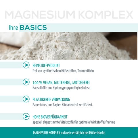 Mikronährstoffprodukt mit Magnesium aus fünf unterschiedlich löslichen und magnesiumreichen Verbindungen in einer Kapsel. Unser hochwertiges Mikronährstoffprodukt wird in vielen handwerklichen Schritten ohne technische Hilfsstoffe inÖsterreich hergestellt und in einer nachhaltigen plastikfreien Papierverpackung geliefert. Reinheitsgarantie: Nur Wirkstoffe ohne technische Hilfsstoffe in schonender Manufaktur verkapselt. Frei von: Magnesiumstearat, Titandioxid und weiteren technischen Hilfsstoffen, Farb-, Geschmacks-,Überzug- und Trennmittel. Rein pflanzliche Kapselhülle, geprüfte Qualität.