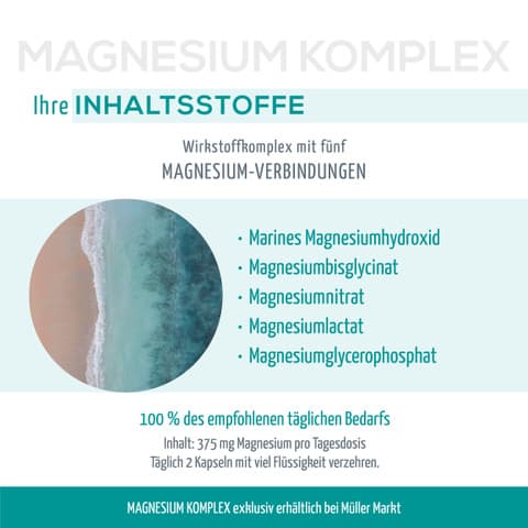 ZutatenMarines Magnesiumhydroxid, Magnesiumbisglycinat, Magnesiumcitrat, Hydroxypropylmethylcellulose (Kapselhülle), Magnesiumlactat, Magnesiumglycerophosphat.