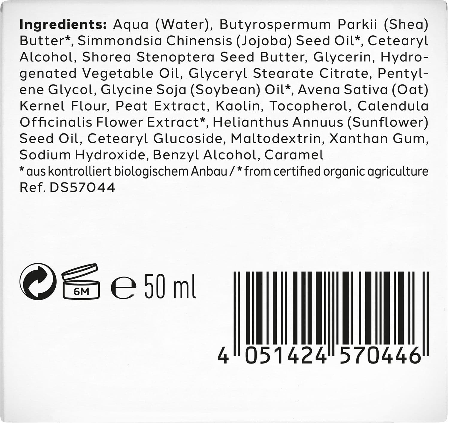 | Inhaltsstoffe | AQUA (WATER), BUTYROSPERMUM PARKII (SHEA) BUTTER*, SIMMONDSIA CHINENSIS (JOJOBA) SEED OIL*, CETEARYL ALCOHOL, SHOREA STENOPTERA SEED BUTTER, GLYCERIN, HYDROGENATED VEGETABLE OIL, GLYCERYL STEARATE CITRATE, PENTYLENE GLYCOL, GLYCINE SOJA (SOYBEAN) OIL*, AVENA SATIVA (OAT) KERNEL FLOUR, PEAT EXTRACT, KAOLIN, TOCOPHEROL, CALENDULA OFFICINALIS FLOWER EXTRACT*, HELIANTHUS ANNUUS (SUNFLOWER) SEED OIL, CETEARYL GLUCOSIDE, MALTODEXTRIN, XANTHAN GUM, SODIUM HYDROXIDE, BENZYL ALCOHOL, CARAMEL *aus kontrolliert biologischem Anbau / *from certified organic agriculture |