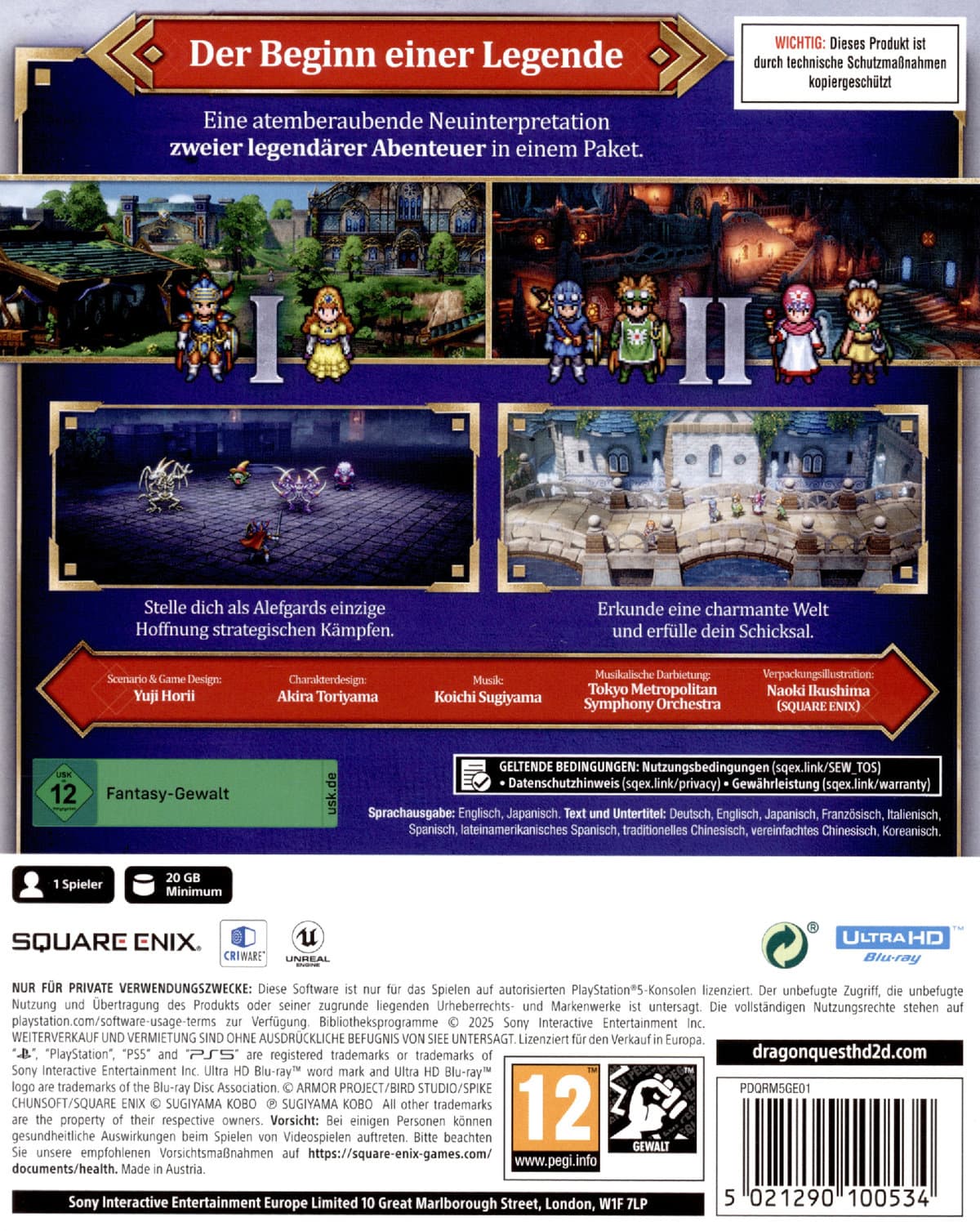 Zwei Erzählungen mutiger Helden beginnen von Neuem. DRAGON QUEST I & II HD-2D Remake ist eine atemberaubende Neuauflage der ersten zwei, legendären Abenteuer der Erdrick-Trilogie in einem Paket. Die Geschichte von DRAGON QUEST I Dank der Heldentaten des legendären Erdricks konnte der Herr der Unterwelt bezwungen werden, und es kehrte wieder Harmonie in das Reich von Alefgard. Doch der hart errungene Frieden sollte nicht von Dauer sein, denn der finstere Drachenfürst erhob sich aus den Schatten und entfesselte erneut Monsterhorden, um das Land zu knechten. Nun liegt es an dir, dem Nachfahren Erdricks, den Bösewicht niederzuringen und die Welt zu retten! Die Geschichte von DRAGON QUEST II Viele Jahre sind ins Land gezogen, seit Alefgard von einem mutigen Helden vor dem sicheren Untergang bewahrt, und dieser fortan den Titel seines legendären Vorfahren führte. Nun stehen drei neue Königreiche in voller Blüte, gegründet vom jüngsten „Erdrick“ und seinen Erben. Doch ein brutaler Überfall grausamer Monster wirft einmal mehr einen dunklen Schatten über die friedvollen Lande. Alles was nun zwischen den finsteren Horden und der Welt steht, ist eine Gruppe junger Thronfolger aus dem Geschlecht Erdricks. Es liegt nun an ihnen, dem Titel ihres berühmten Vorfahren alle Ehre zu machen! DIE CHARAKTERE • Der Held - Du bist ein junger Mann, der vom legendären Helden Erdrick abstammt. Du besitzt den Mut und die Stärke, dich Monstern zu stellen – und zugleich ein gutes Herz. Du machst dich auf den Weg, den Drachenfürst zu besiegen und Erdricks Vermächtnis fortzuführen. • Prinzessin Gwaelin - Die einzige Tochter des Königs von Tantigel besitzt die Gabe, die Stimme von Rubiss zu hören. Sie ist lebensfroh, freundlich und wird vom Volk geliebt – doch vor einigen Monaten wurde sie vom Drachenfürst entführt und ist seither verschwunden. DIE WELT • DRAGON QUEST I - Spielt im Land namens Alefgard, das von Rubiss erschaffen wurde. Der Held bricht von Tantigel aus auf und begibt sich auf eine Reise rund um die Welt. • DRAGON QUEST II - Eine weite Welt mit verschiedenen Städten und Burgen, darunter auch der Kontinent, auf dem einst die legendären Held*innen wandelten. Midenhall, Cannock und Mondbach – gegründet von den Nachfahr*innen des Helden Erdrick – sind als die Drei Großen Königreiche bekannt und pflegen Beziehungen zueinander.