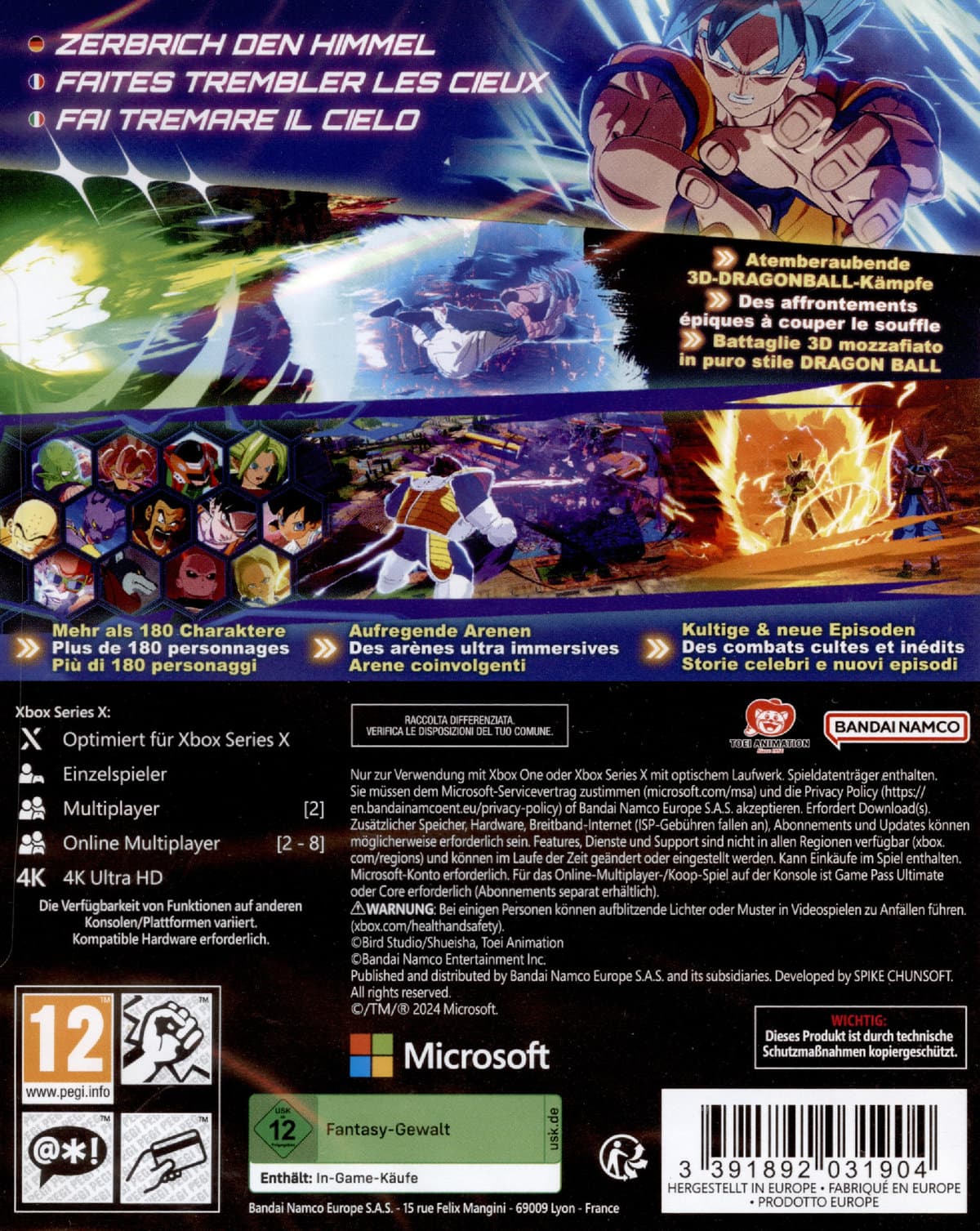 Nutze die Zerstörungskraft der stärksten Kämpfer, die jemals in DRAGON BALL angetreten sind! DRAGON BALL: Sparking! ZERO bringt das legendäre Gameplay der Budokai-Tenkaichi-Serie auf eine völlig neue Stufe. Erlerne und meistere eine unglaubliche Gruppe spielbarer Charaktere, jeder mit individuellen Fähigkeiten, Transformationen und Techniken. Entfessele den Kampfgeist in dir und tritt in Arenen an, die zerfallen und auf deine Kraft reagieren, während der Kampf tobt. TEMBERAUBENDE 3D-KÄMPFE Tritt im authentischen Stil der Anime- und Videospielserien in rasanten 3D-Kämpfen an, die dein Herz schneller schlagen lassen. Erlebe atemberaubende Grafik und bekannte Kampf-Moves wie Strahleneinschläge, Sprintangriffe, blitzschnelle Bewegungen und planetenvernichtende ultimative Angriffe. DIE ERDE WIRD BEBEN Betritt eine Arena, die auf jede deiner Aktionen reagiert. Wenn du dich transformierst oder deine verheerendsten Angriffe entfesselst, wirkt sich dies verblüffend realistisch auf die Umgebung aus. Hinterlasse eine Spur der Zerstörung, während du nach Herzenslust kämpfst. BAHNE DIR EINEN NEUEN WEG Stürze dich in die actiongeladenen Kämpfe der geliebten Originalgeschichte oder entdecke neue Begegnungen und schalte sie für deine Z-Kämpfer frei und mehr. Erlebe deine Lieblingsmomente aus der Serie in Zwischensequenzen aus der Sicht der acht Charaktere noch einmal! ERSTELLEN, SPIELEN UND TEILEN Erstelle deine Lieblingskämpfe aus der Geschichte von DRAGONBALL oder entwirf deinen Traumkampf mit deinen Lieblingscharakteren! Teile deine Kreationen mit anderen Fans und erlebe die Kämpfe, die die Fantasie rund um die Welt zum Leben erweckt hat. RIVALEN MACHEN DICH STÄRKER Fordere andere Spieler online heraus, um deine Fähigkeiten zu testen, oder triff dich offline mit Freunden, um im Raum von Zeit und Geist dein Können zu verbessern! Kämpfe dich durch verschiedene Turniermodi und Siegbedingungen, um Champion zu werden.
