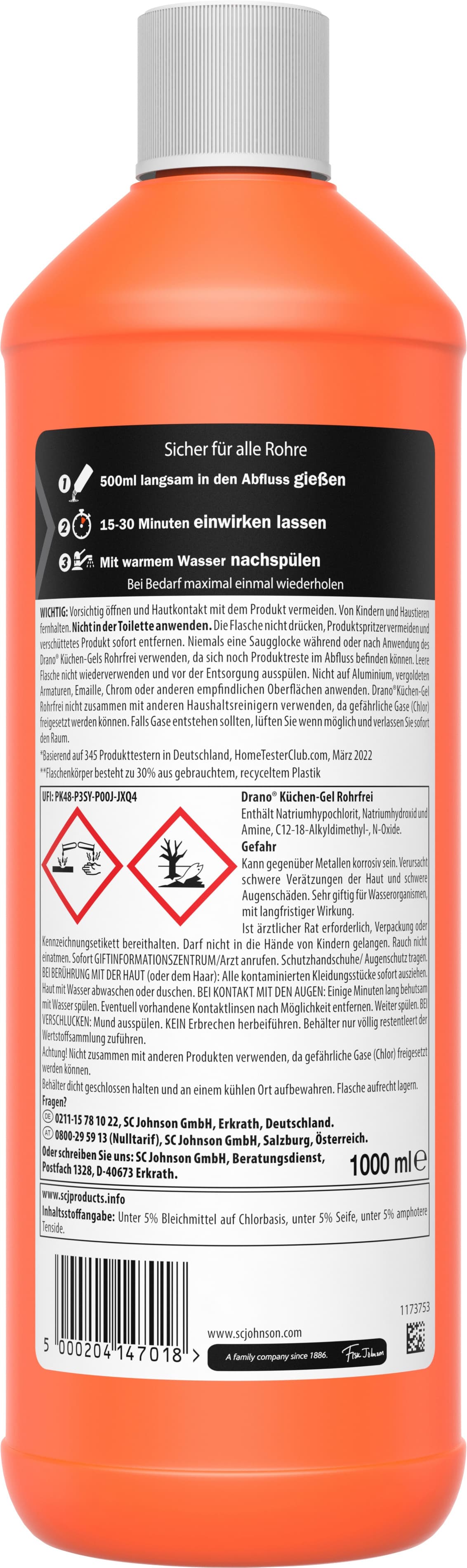 GefahrEnthält Natriumhypochlorit; Natriumhydroxid; Amine, C12-18-Alkyldimethyl-,N-Oxide. WICHTIG: Vorsichtig öffnen und Hautkontakt mit dem Produkt vermeiden. Von Kindern und Haustieren fernhalten. Nicht in der Toilette anwenden. Die Flasche nicht drücken, Produktspritzer vermeiden und verschüttetes Produkt sofort entfernen. Niemals eine Saugglocke während oder nach der Anwendung des Drano Küchen-Gels Rohrfrei verwenden, da sich noch Produktreste im Abfluss befinden können. Leere Flasche nicht wiederverwenden und vor der Entsorgung ausspülen. Nicht auf Aluminium, vergoldeten Armaturen, Emaile, Chrom oder anderen empfindlichen Oberflächen anwenden. Achtung! Drano Küchen-Gel Rohrfrei nicht zusammen mit anderen Haushaltsreinigern verwenden, da gefährliche Gase (Chlor) freigesetzt werden können. Falls Gase entstehen sollten, lüften Sie wenn möglich und verlassen Sie sofort den Raum.