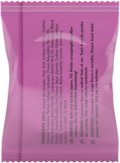 | Inhaltsstoffe | Sodium Bicarbonate, Citric Acid, Sodium Chloride, Sorbitol, Calcium Carbonate, Parfum, Sodium Carbonate, Prunus Amygdalus Dulcis Oil, Citrus Aurantium Dulcis Peel Oil, Cymbopogon Martini Herb Oil, Hydrolyzed Wheat Protein, Vanilla Planifolia Fruit Extract, Aqua, Glycerin, Sodium Citrate, Sodium Sulfate, Sodium Coco-Sulfate, Linalool, Alpha-Isomethyl Ionone, Limonene, Benzyl Alcohol, Geraniol, CI 16255, CI 28440 |