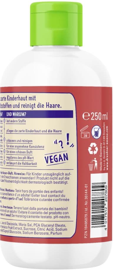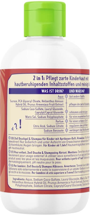 InhaltsstoffeAqua, Sodium Coco-Sulfate, Lauryl Glucoside, Sodium Chloride, PCA Glyceryl Oleate, Helianthus Annuus Hybrid Oil, Prunus Armeniaca Fruit Extract, Sucrose, Citric Acid, Sodium Polyphosphate, Sodium Citrate, Caprylyl/Capryl Glucoside, Sodium Benzoate, Parfum