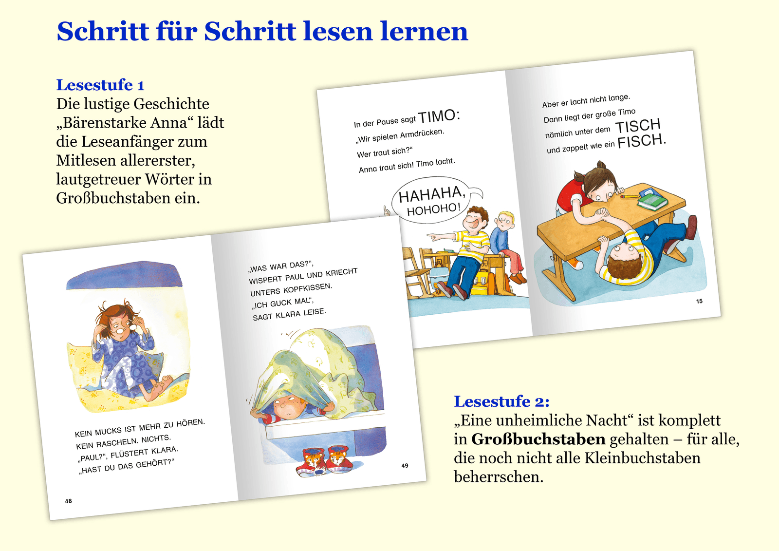 - Die lustige Geschichte „Bärenstarke Anna“ lädt die Leseanfänger zum Mitlesen allererster, lautgetreuer Wörter in Großbuchstaben ein.