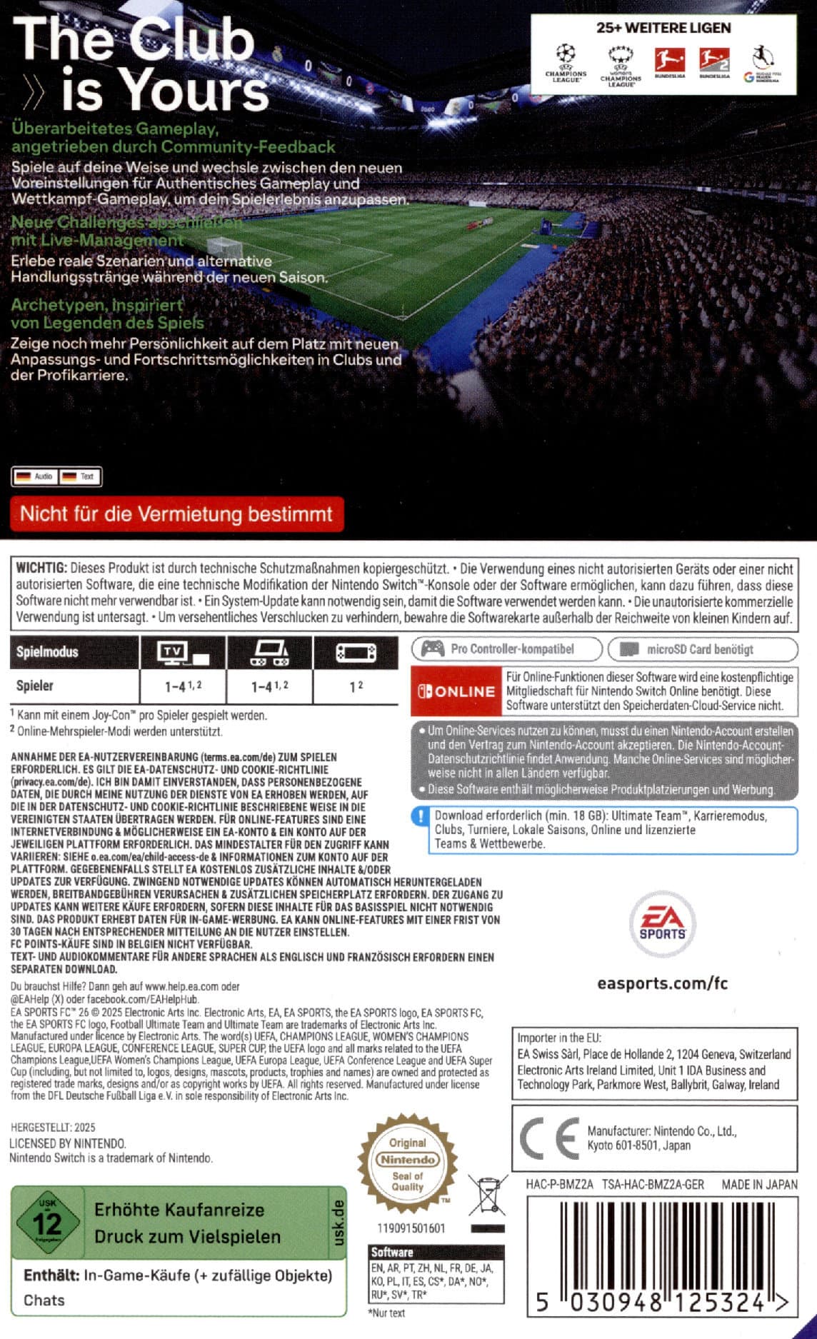 The Club is Yours in EA SPORTS FC 26 Spiele auf deine Weise mit einem überarbeiteten Gameplay-Erlebnis, das durch Feedback aus der FC-Community angetrieben wird. Das neue "Authentisches Gameplay"-Preset liefert unser bisher realistischstes Fußballerlebnis im Karrieremodus, während das "Wettkampf-Gameplay"-Preset - angetrieben durch verfeinerte Grundlagen, gesteigerte Konsistenz und erhöhte Reaktionsfähigkeit - speziell für Football Ultimate Team™ und Clubs gemacht ist. Stelle dein Traumteam in Football Ultimate Team™ auf die Probe mit Turnieren und Live-Events sowie einem erneuerten Rivals- und Champs-Erlebnis. Turniere testen deine Fähigkeiten mit bis zu vier Runden im K.O.-System, während Live-Events mit themenbezogenen Wettbewerben und Inhalten während der gesamten Saison für mehr Abwechslung sorgen. Neue Prämien ermöglichen dir es, zusätzliche Boni zu verdienen oder deinen wöchentlichen Fortschritt zu beschleunigen. Zudem führt EA SPORTS FC™ 26 "Challengers" ein, eine neue zweitklassige Wochenend-Meisterschaft, die auf Profis in niedrigeren Divisionen ausgelegt ist. Erlebe die Managementkarriere wie nie zuvor mit brandneuen Live-Management-Challenges. Bewältige eine Vielzahl realer Szenarien und alternativer Handlungsstränge während der neuen Saison - von wenigen Minuten Spielzeit bis hin zu mehreren Saisons - und verdiene Boni, darunter Saisonpunkte, Deko sowie ICONs und Heroes, die in Clubs der modernen Zeit genutzt werden können. Zusätzlich verändern erstmals im Management-Markt neue Coaches an der Spitze die Teamtaktiken, was die Dynamik jeder neuen Saison beeinflusst. Erlebe unerwartete Ereignisse während deiner Karriere, indem du kurzfristige und langfristige Angelegenheiten managst, die die Zukunft deines Clubs mitgestalten. Von den Legenden des Spiels inspirierte Archetypen führen neue Klassen für Clubs und die Profikarriere ein, die deinem Profi noch mehr Individualität bei der Anpassung und Fortschritt verleihen. Entwickle deine Fähigkeiten im Laufe der Saison weiter, indem du Attribute verbesserst und neue Archetyp-Vorteile freischaltest, um deinem Profi auf dem Platz ein unverkennbares Gefühl zu verleihen. Spiele solo oder mit deinen Clubmitgliedern in den Clubs-Rush-Live-Events, die eine Reihe aufregender neuer K.O.-Turniere in Clubs in EA SPORTS FC™ 26 einführen. Mit variierenden Eintrittsvoraussetzungen und Spielregeln bieten die Turniere frische Erlebnisse mit neuen Zielen und aufregenden Boni während der gesamten Saison und verbinden Clubs mit laufenden Kampagnen in EA SPORTS FC™ 26. Erlebe beispiellose Authentizität in EA SPORTS FC™ 26, mit über 20.000 Profis in mehr als 750 Clubs und Nationalmannschaften, in über 120 Stadien und mehr als 35 Ligen. EA SPORTS FC™ 26 ist der einzige Ort, an dem du die legendäre UEFA Champions League, UEFA Europa League, UEFA Europa Conference League, CONMEBOL Libertadores, Premier League, Bundesliga und LALIGA EA SPORTS im selben Spiel spielen kannst, sowie die Google Pixel Frauen-Bundesliga, Liga F Moeve, Barclays Women's Super League, Arkema Premiere Ligue, National Women's Soccer League und die UEFA Women's Champions League.