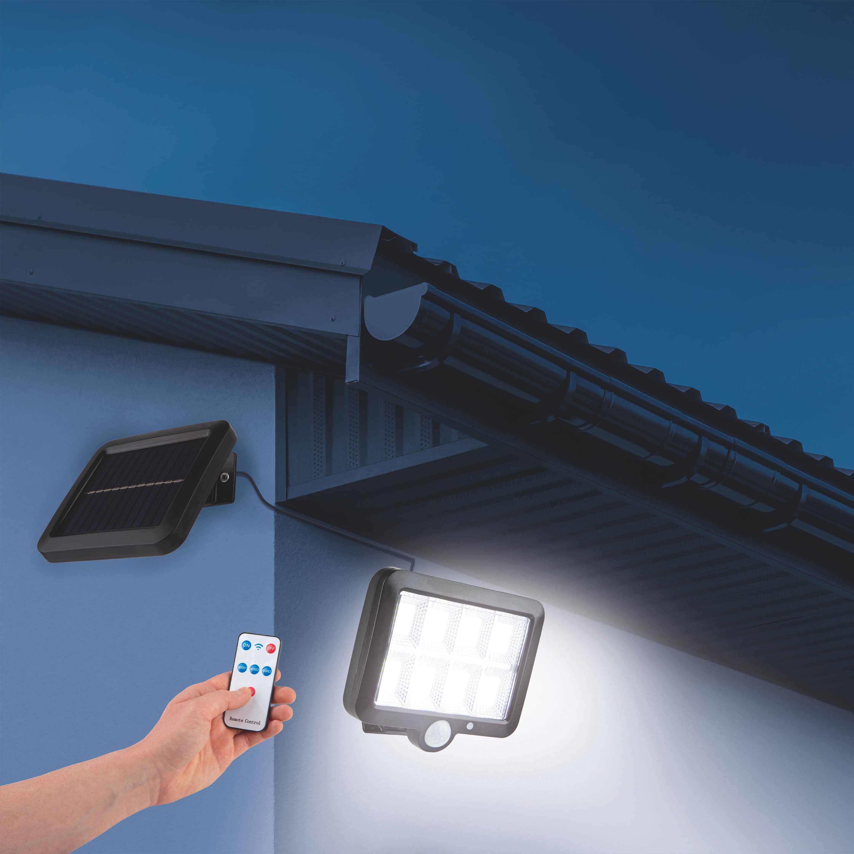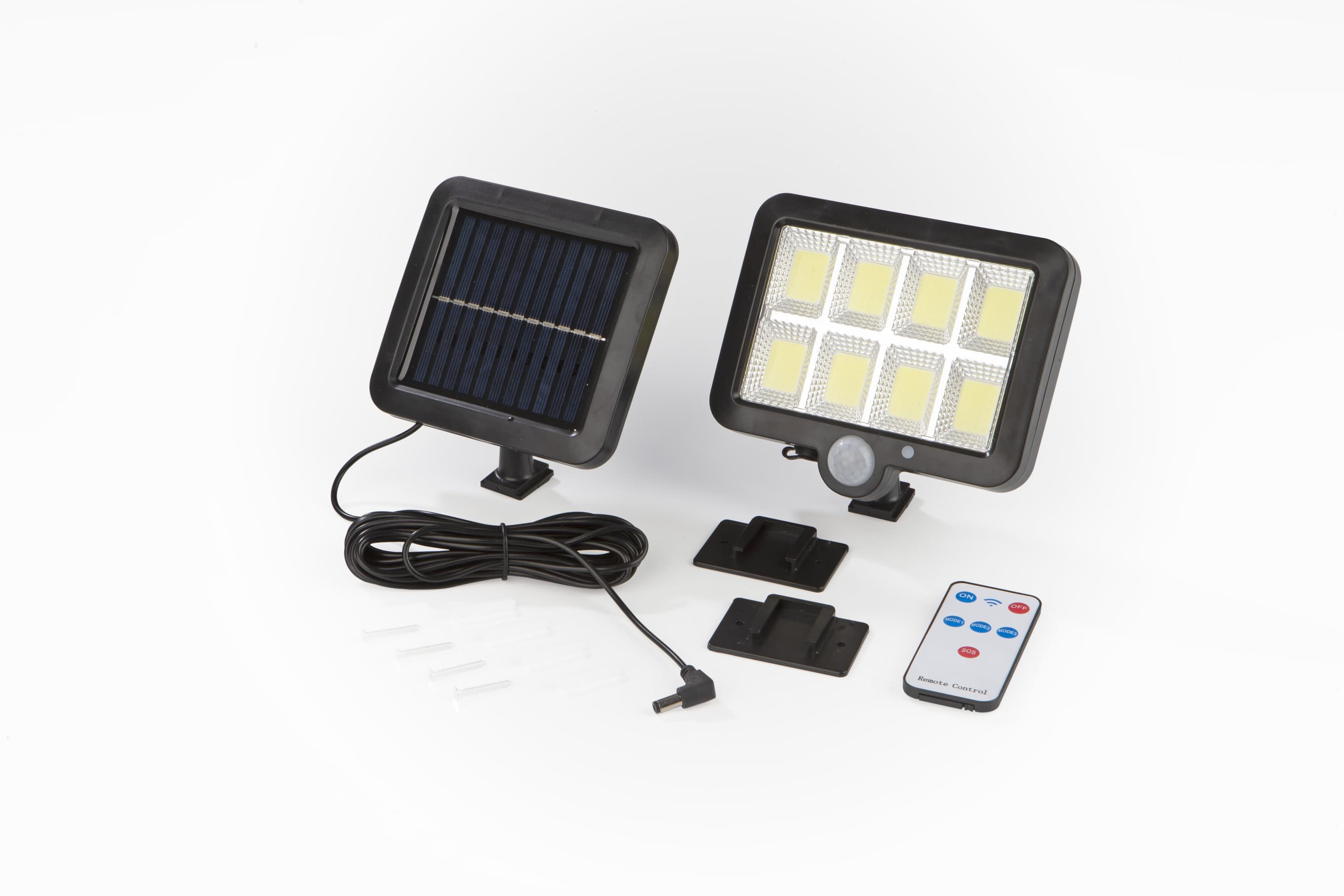 | Lieferumfang | 1x Solarstrahler, 1x Fernbedienung, 2x Schrauben und 2x Dübel zur Wandmontage |