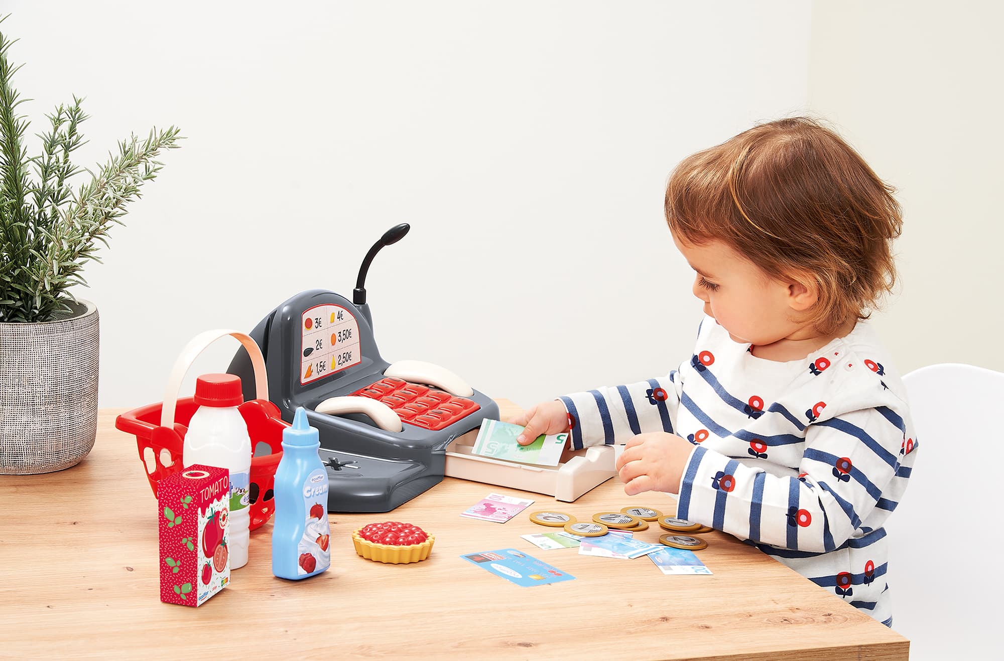 Die grüne Spielkasse ist das Herzstück des Sets und verfügt über ein Tastenfeld sowie ein Mikrofon für Durchsagen. Im Lieferumfang sind neben der Kasse auch ein roter Einkaufskorb, Münzen, Scheine und eine Spielzeug-Kreditkarte enthalten. Verschiedene Lebensmittelverpackungen wie eine Milchtüte, Nudeln oder eine Schokoladenflasche runden das Einkaufserlebnis ab und bieten zahlreiche Möglichkeiten für fantasievolle Rollenspiele im Kinderzimmer.